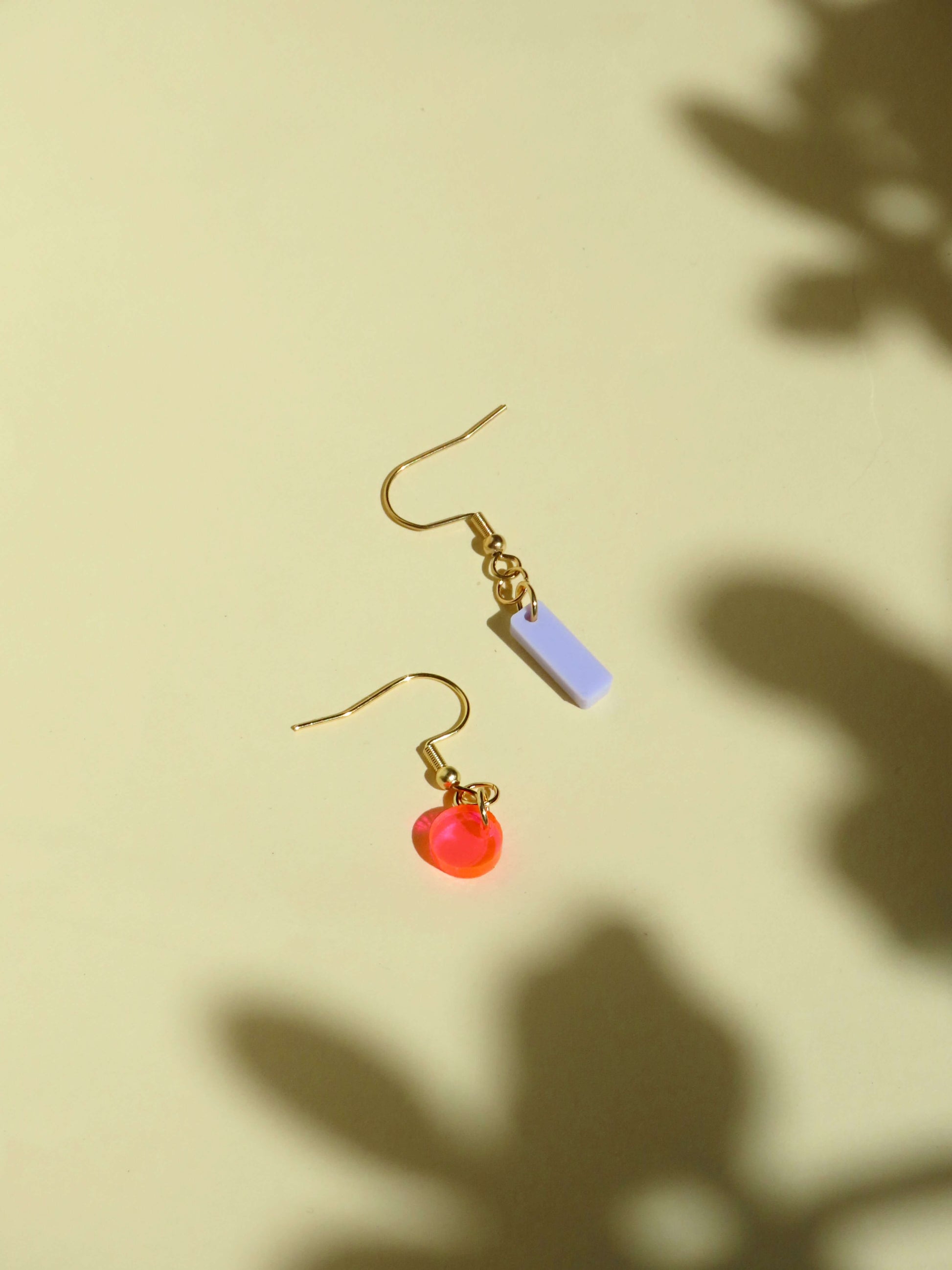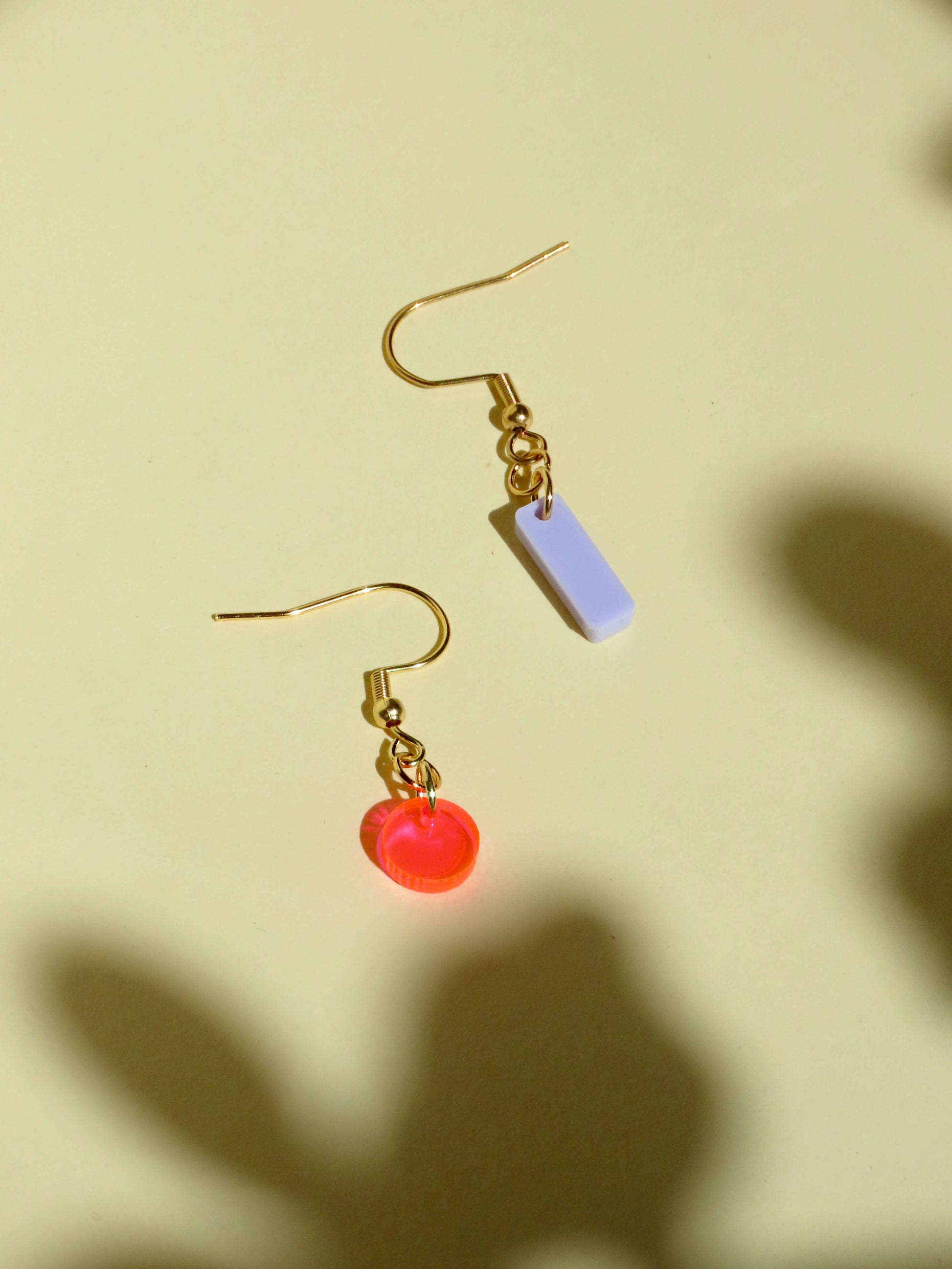 Die Dots & Stick Ohrringe leben vom Kontrast – nicht nur durch Farben und Formen, sondern auch durch ihre Asymmetrie.
