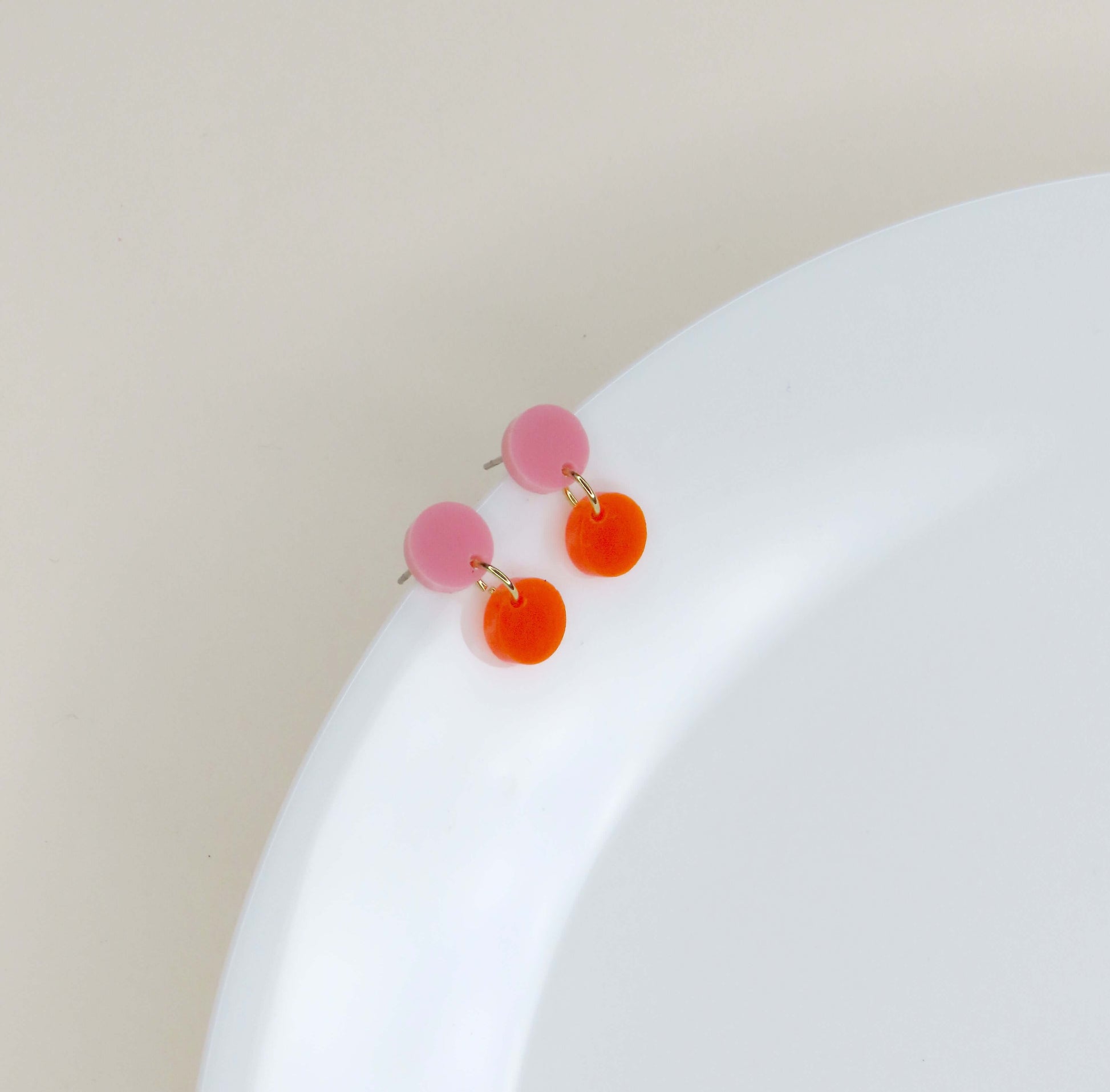 Zwei runde Acryl-Elemente, verbunden durch ein feines goldenes Detail, bringen frische Sommerlaune an deine Ohren.