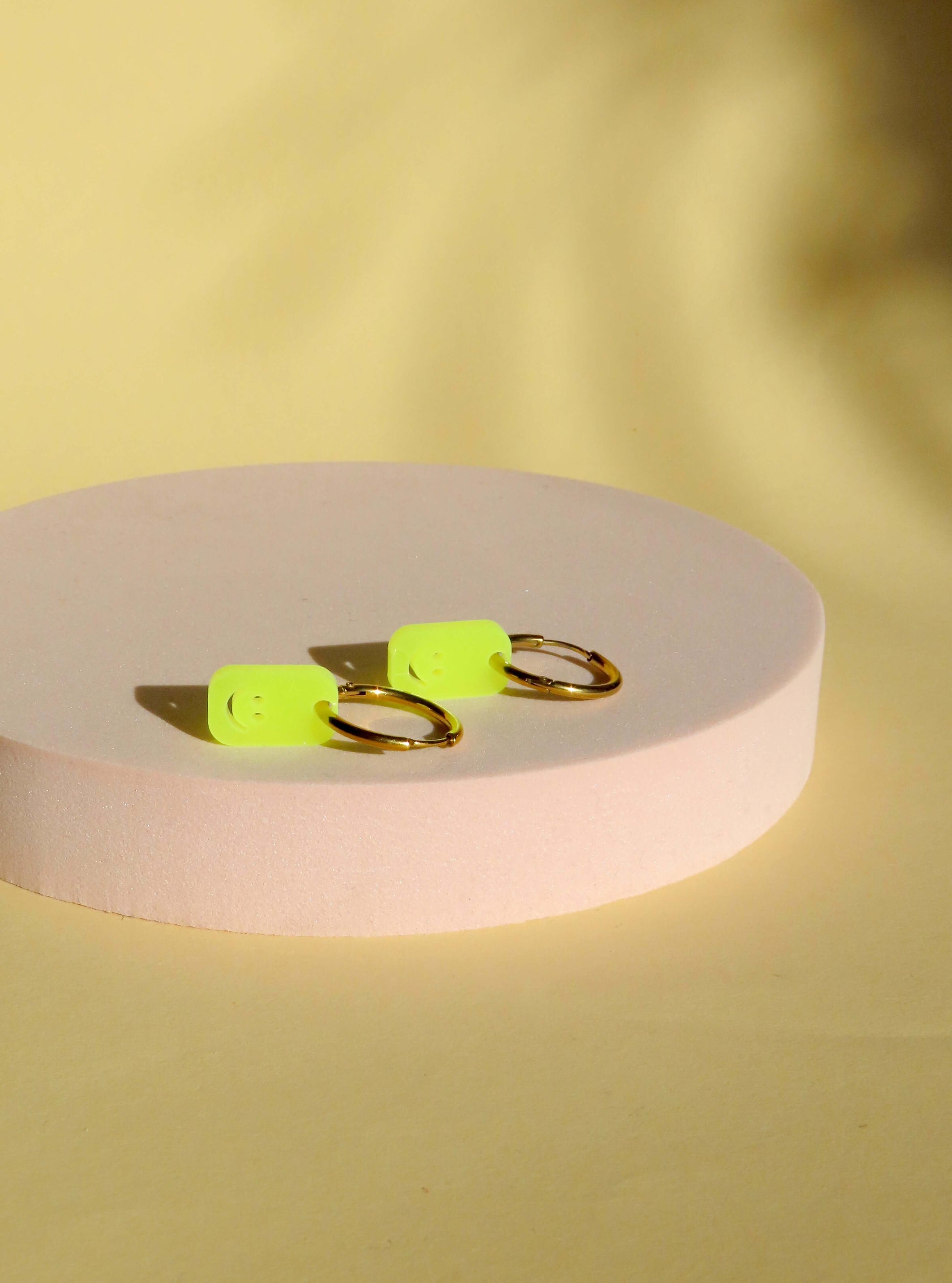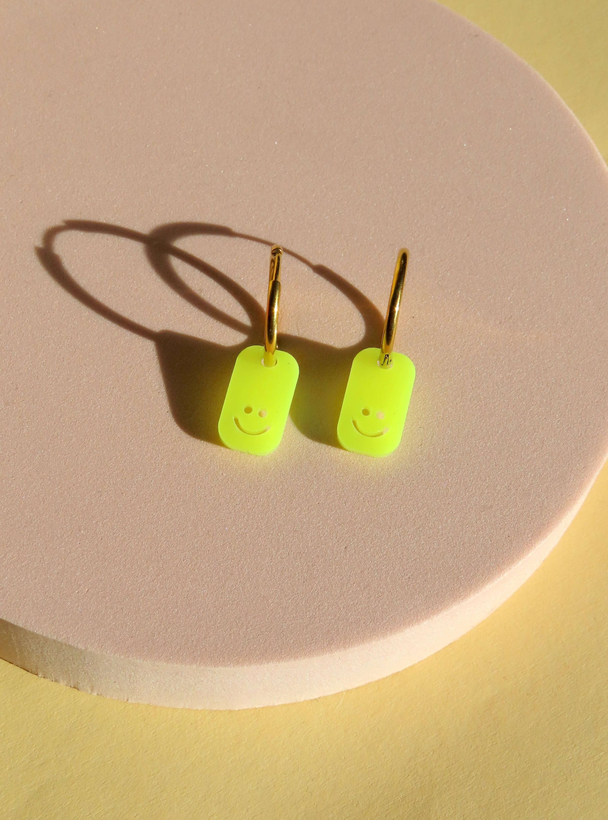 Ein kleines Rechteck, das strahlt: Die Smiles Ohrringe kombinieren neonfarbenes Acryl mit einer zarten Edelstahl-Creole.