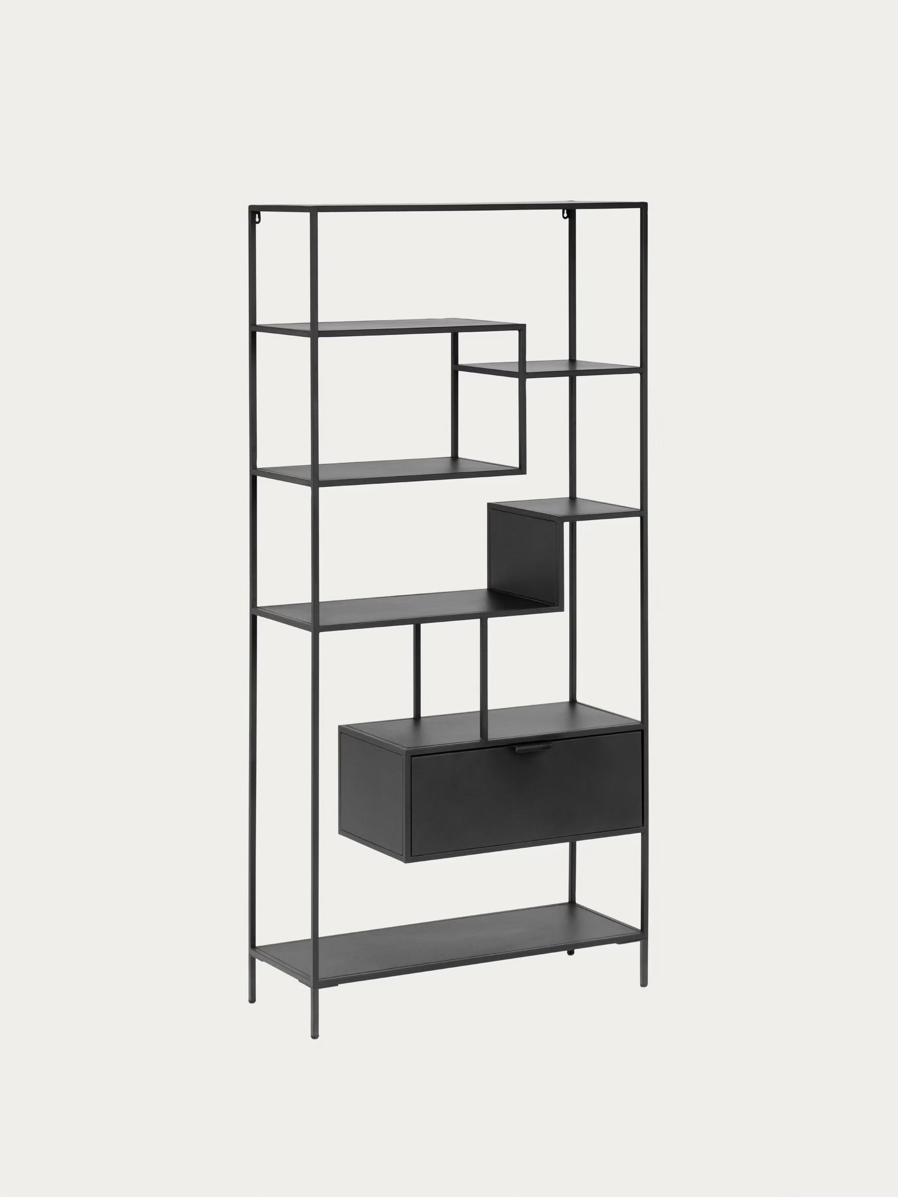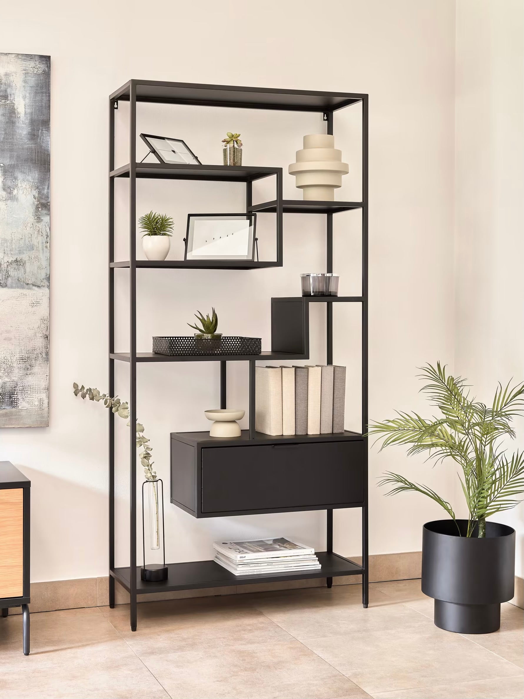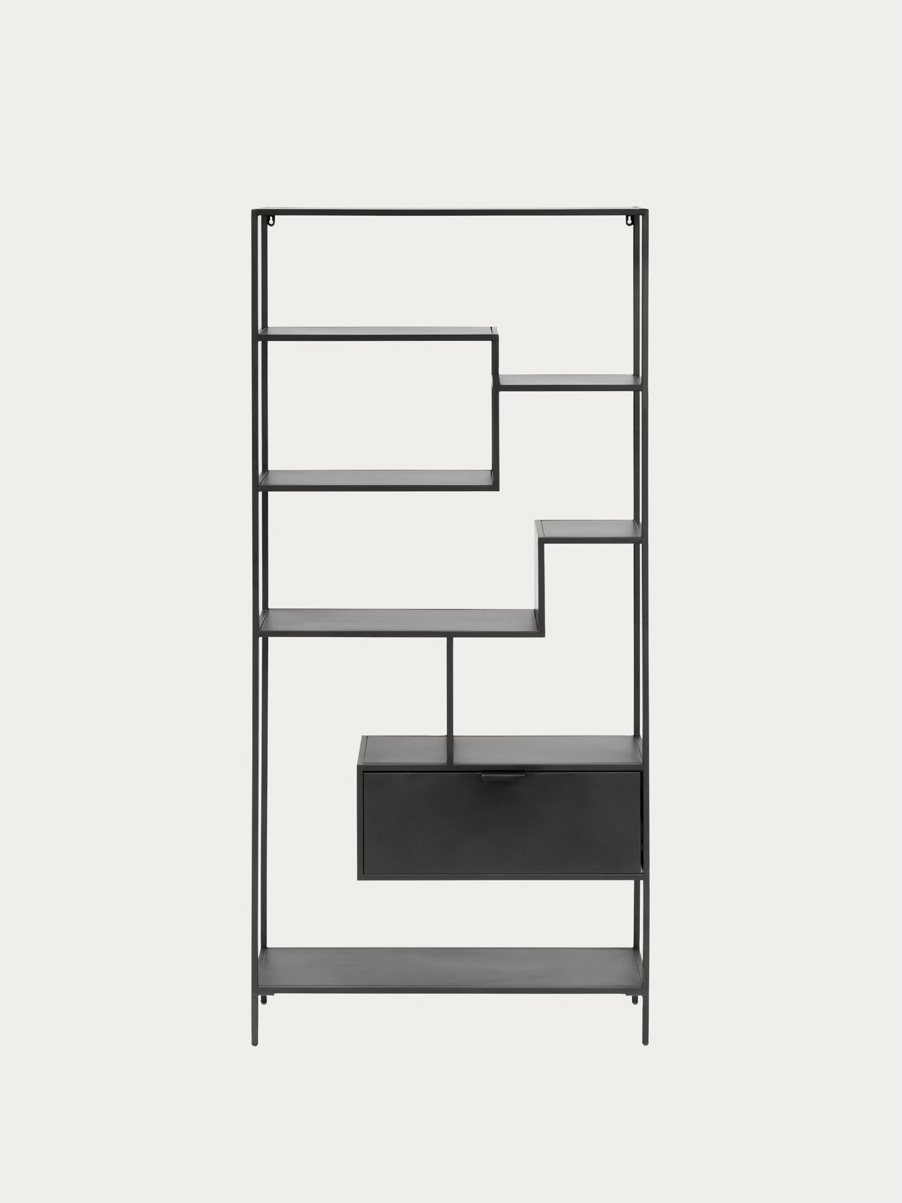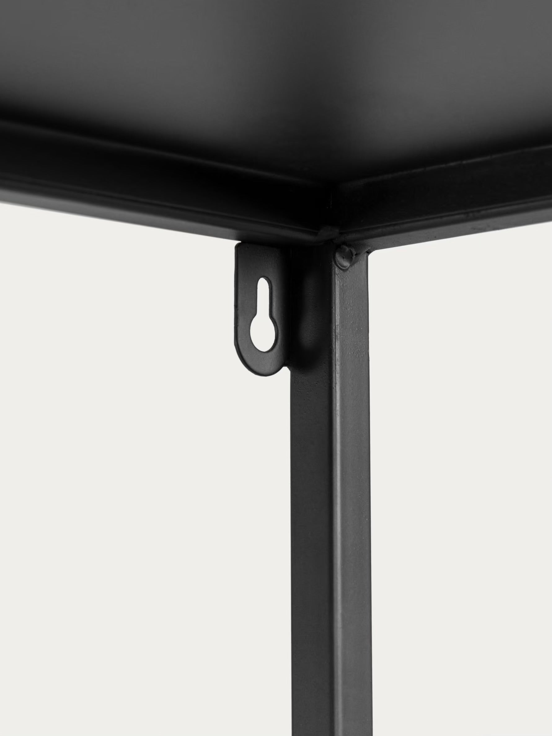 Ausgefallenes, handgefertigtes Eisenregal von Kave Home im nordischen Industrie Look. Der schwarz lackierte Stahl passt sich seiner Umgebung zurückhaltend an und ist dennoch ein echter Eyecatcher. Design und Funktionalität zu gleichen Teilen. Es fügt sich in jedes Ambiente, von klassisch bis modern. Jedes Teil ist ein Unikat.