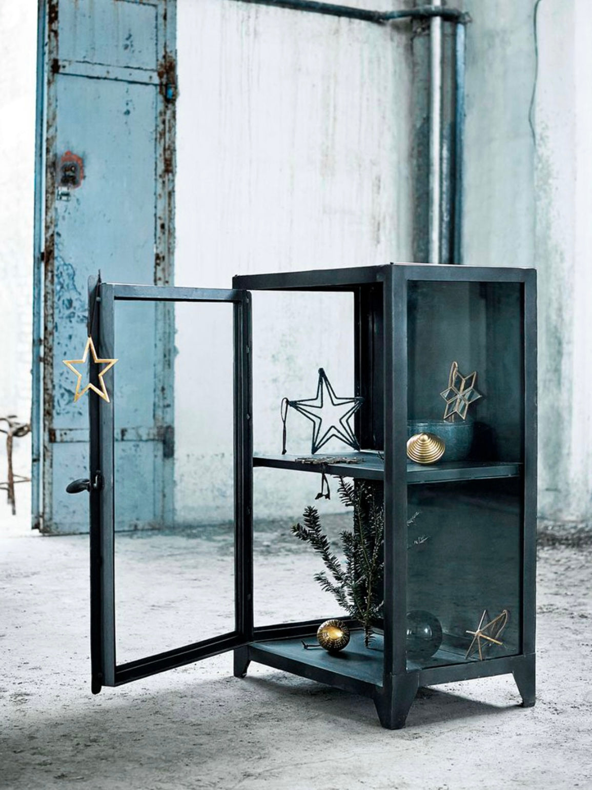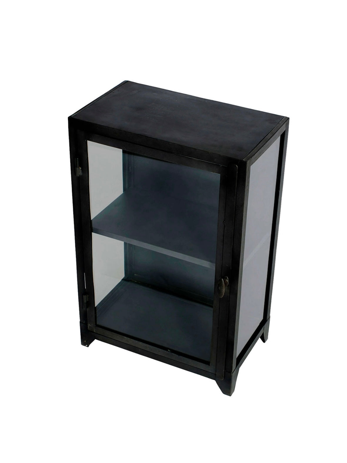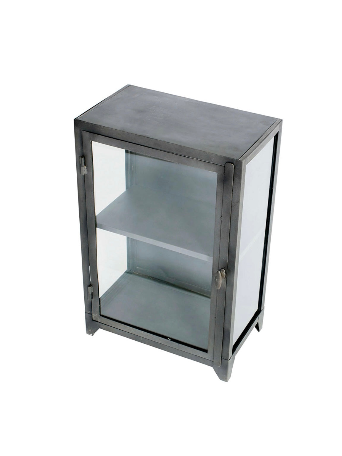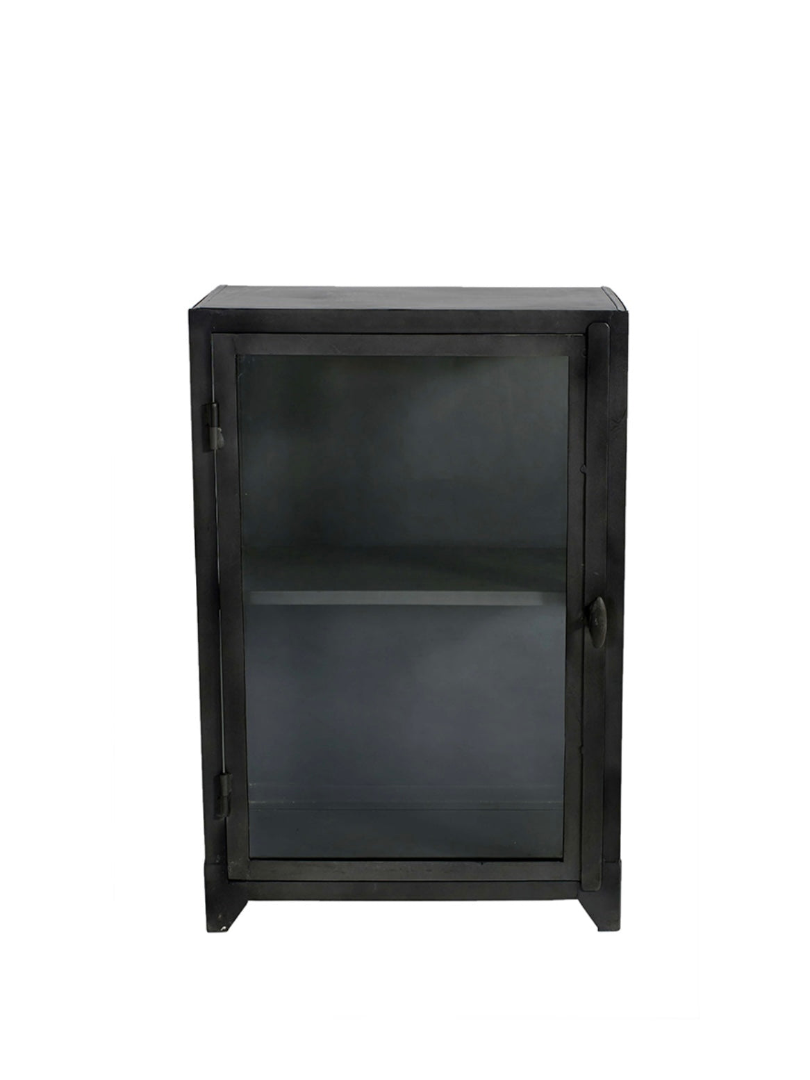 90cm hohe Eisenvitrine mit einer durchsichtigen Glastür. Die Seitenelemente sind ebenfalls aus Glas. Ein Einlegeboden. Ideal als Barschrank, für Gläser oder für Geschirr.