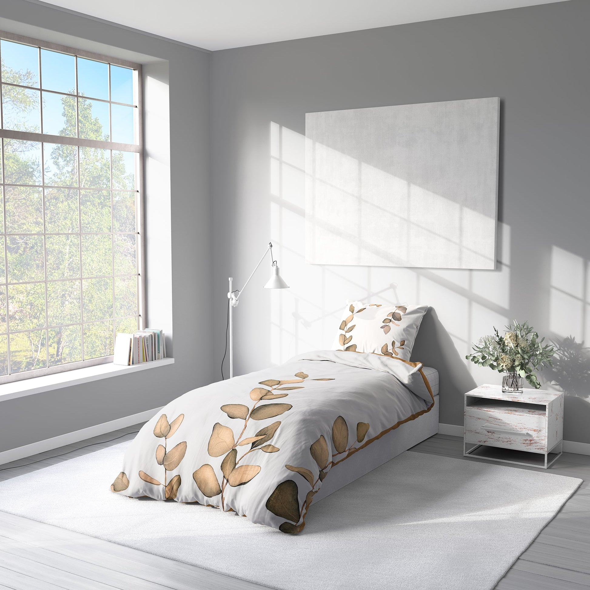 Sanfte Naturharmonie: Die "Eukalyptus" Bettwäsche von Leslis verbindet die beruhigende Präsenz von Eukalyptusblättern mit einer Palette warmer Beigetöne, die eine Atmosphäre von Ruhe und Geborgenheit schafft. Dieses Design lädt dazu ein, sich in die entspannende Umarmung der Natur zu begeben und jeden Tag mit einem Gefühl der Erholung und des Friedens zu beginnen.