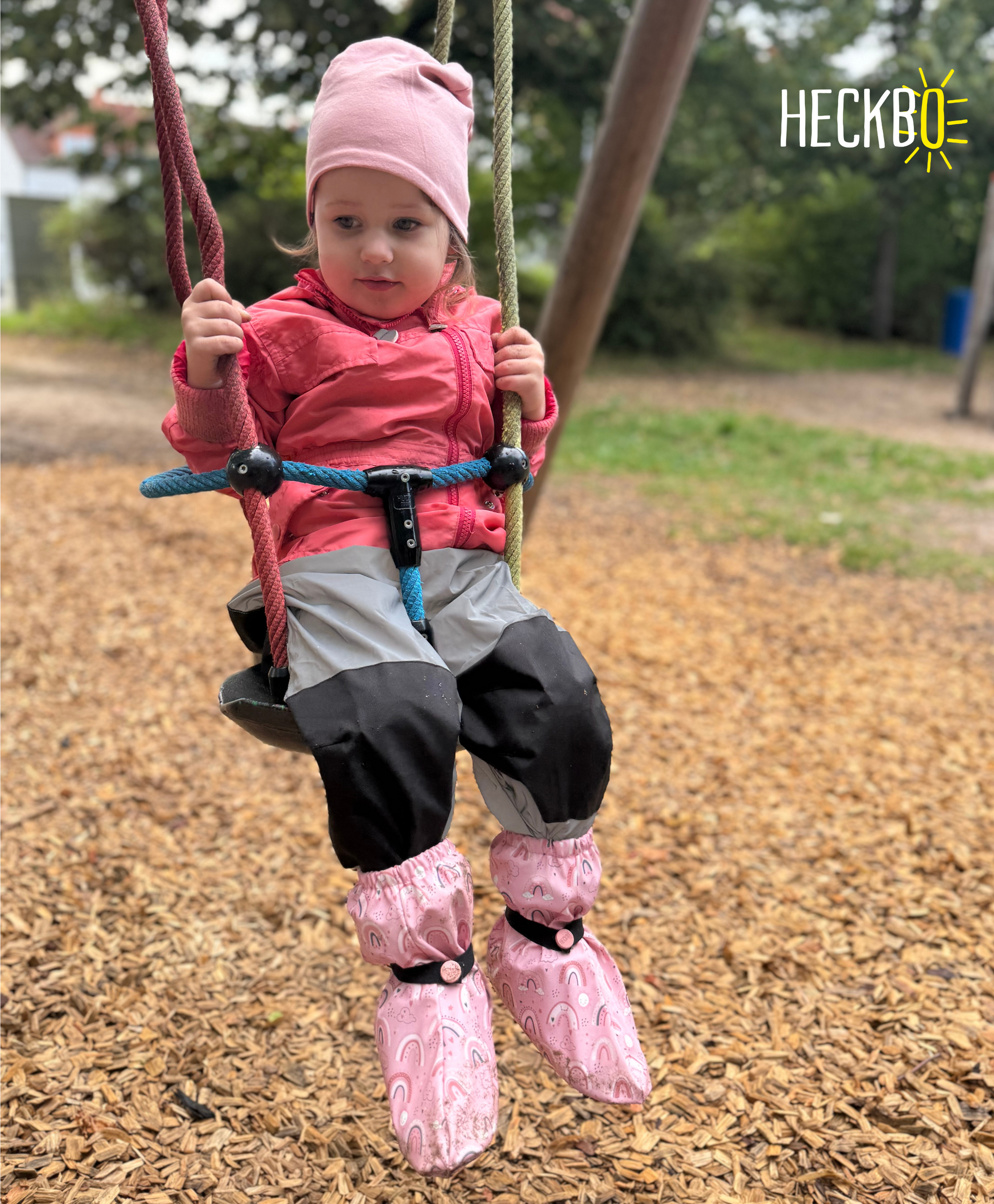Die farbenfrohen HECKBO Baby-Regenfüßlinge im liebevollen Regenbogen-Design sind in zwei praktischen Größen verfügbar: