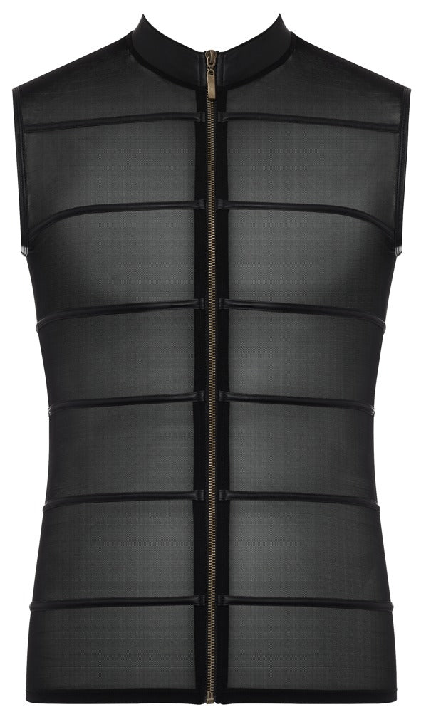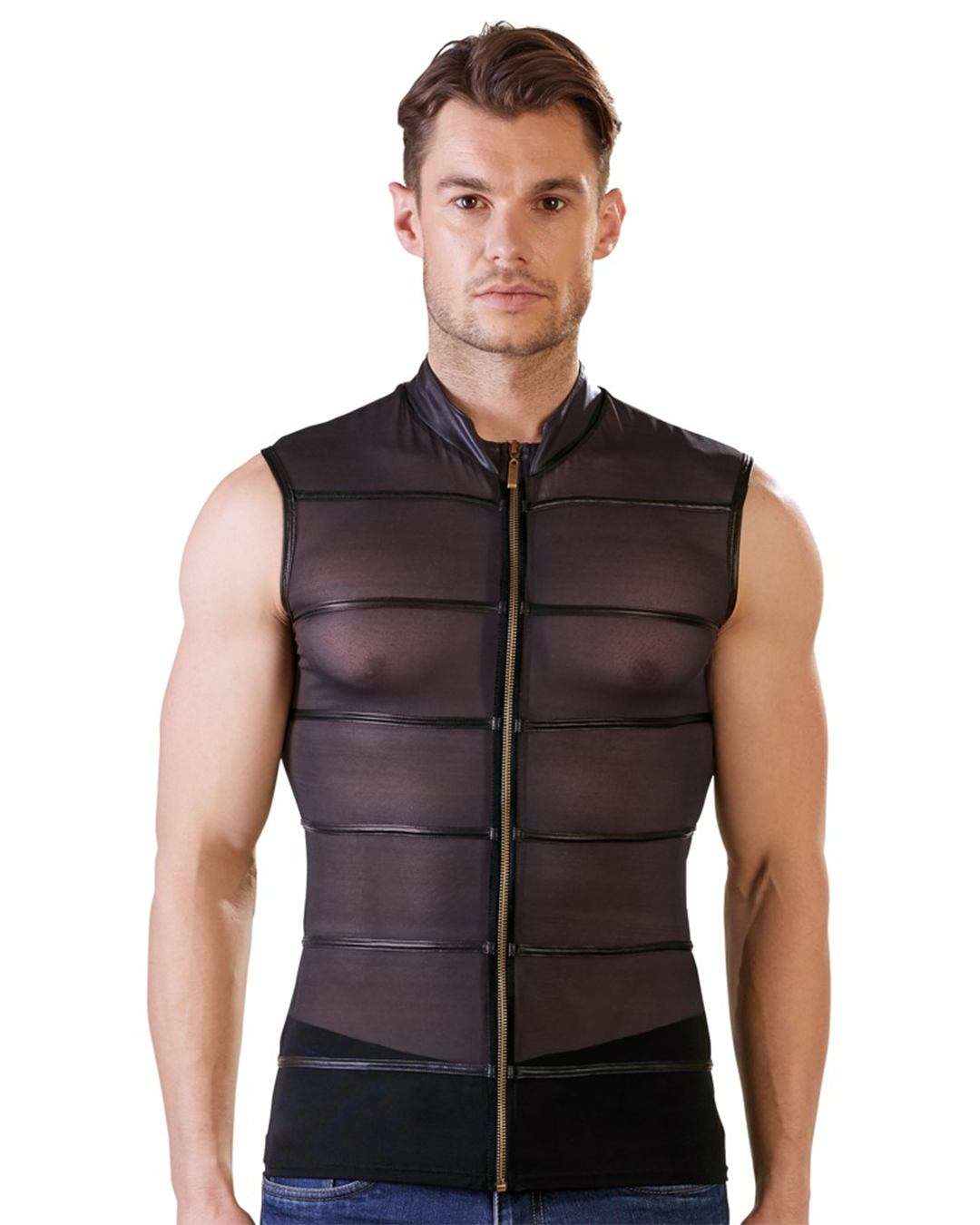Show off the muscles because this sleeveless black Powernet shirt will make them the center of attention. The transparent material is broken up by matte black stripes that add that exciting touch to the shirt. The stretchy high-neck shirt has a small stand-up collar and can be unzipped in the blink of an eye because of the full-length zip at the front.