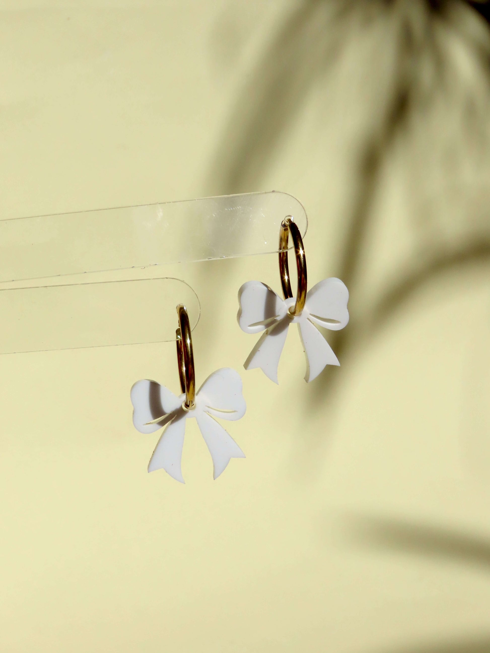 Goldene Creolen mit weißen Schleifen – verspielte Ohrringe mit 3D-Effekt