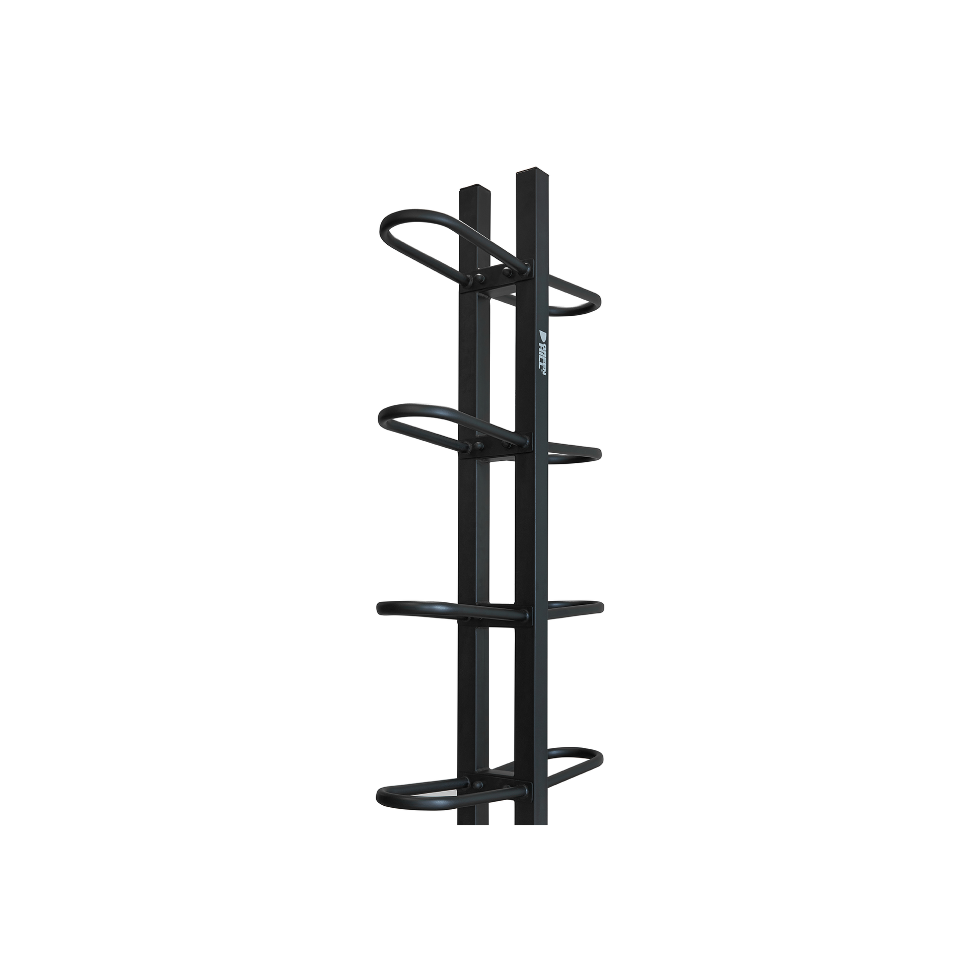 Die 4 Gummifüße an der Basis des Ständers sorgen für zusätzliche Stabilität auf jedem Boden. Dieser doppelseitige Bodenständer ist eine praktische Lösung für die Aufbewahrung von Medizinbällen in Turnhallen.