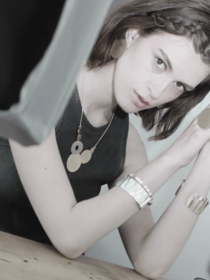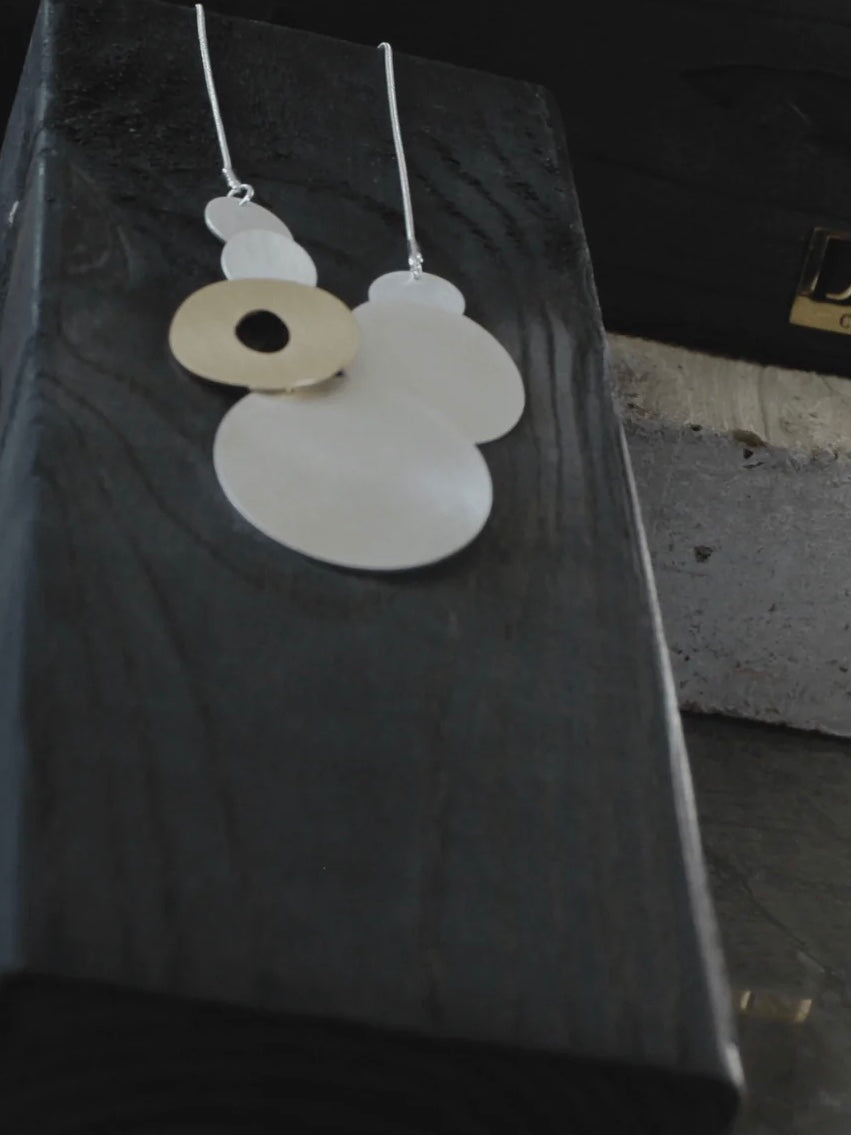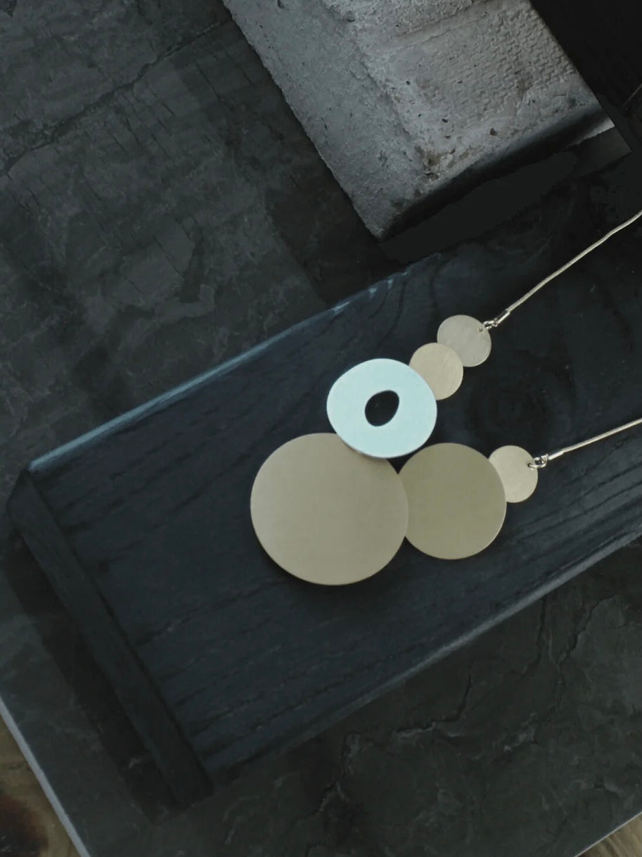 Modische, 2-farbige Statementhalskette aus matt versilbertem oder matt vergoldeten Messing. Mit runden Anhängern in unterschiedlichen Größen an einer Schlangenkette gearbeitet. Variabel in der Länge einstellbar.