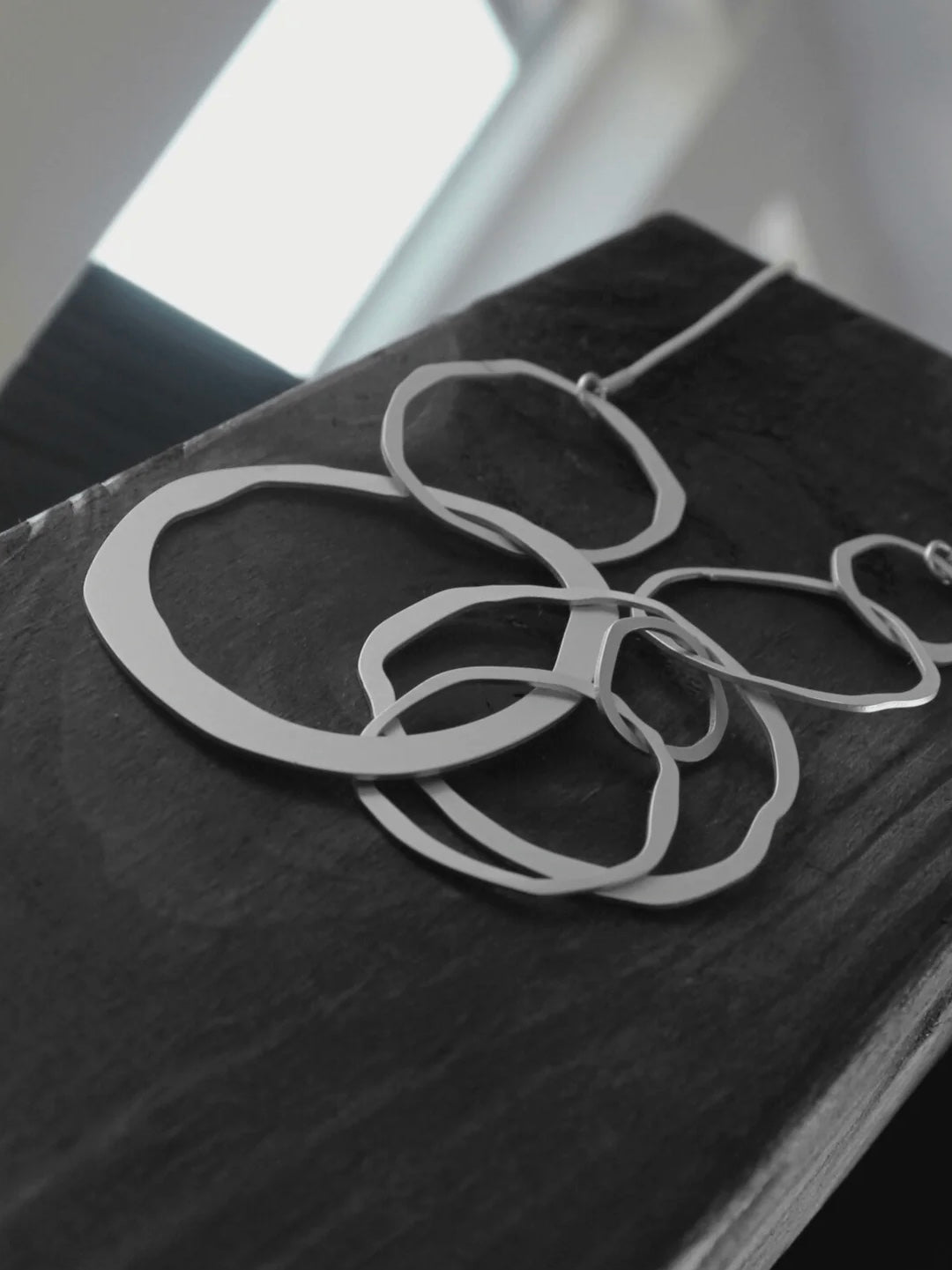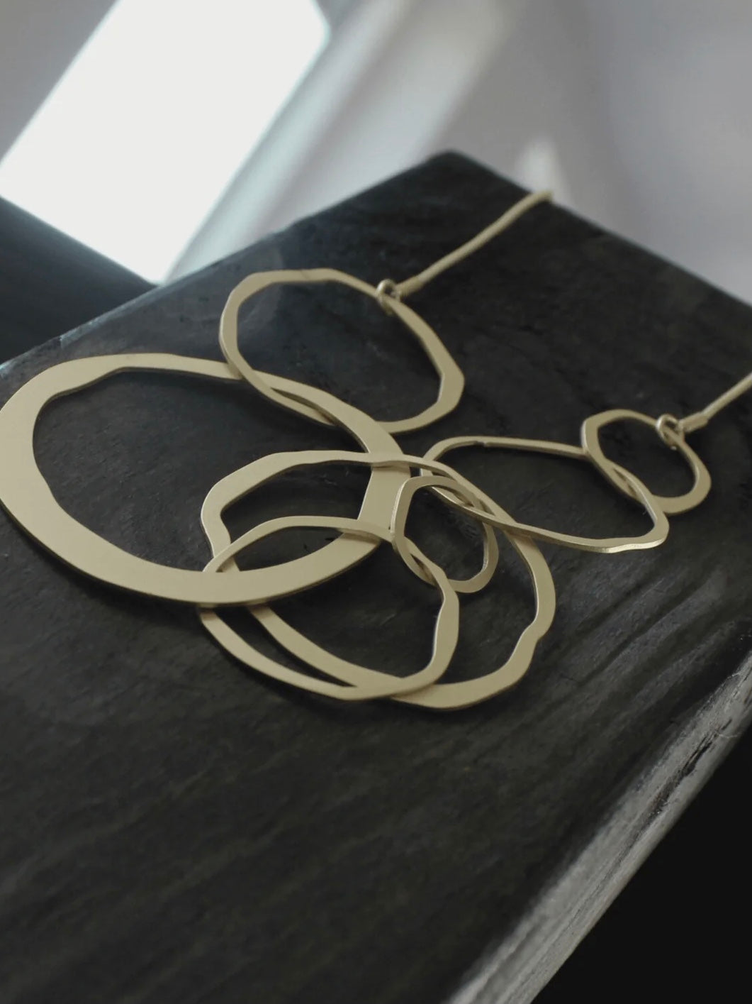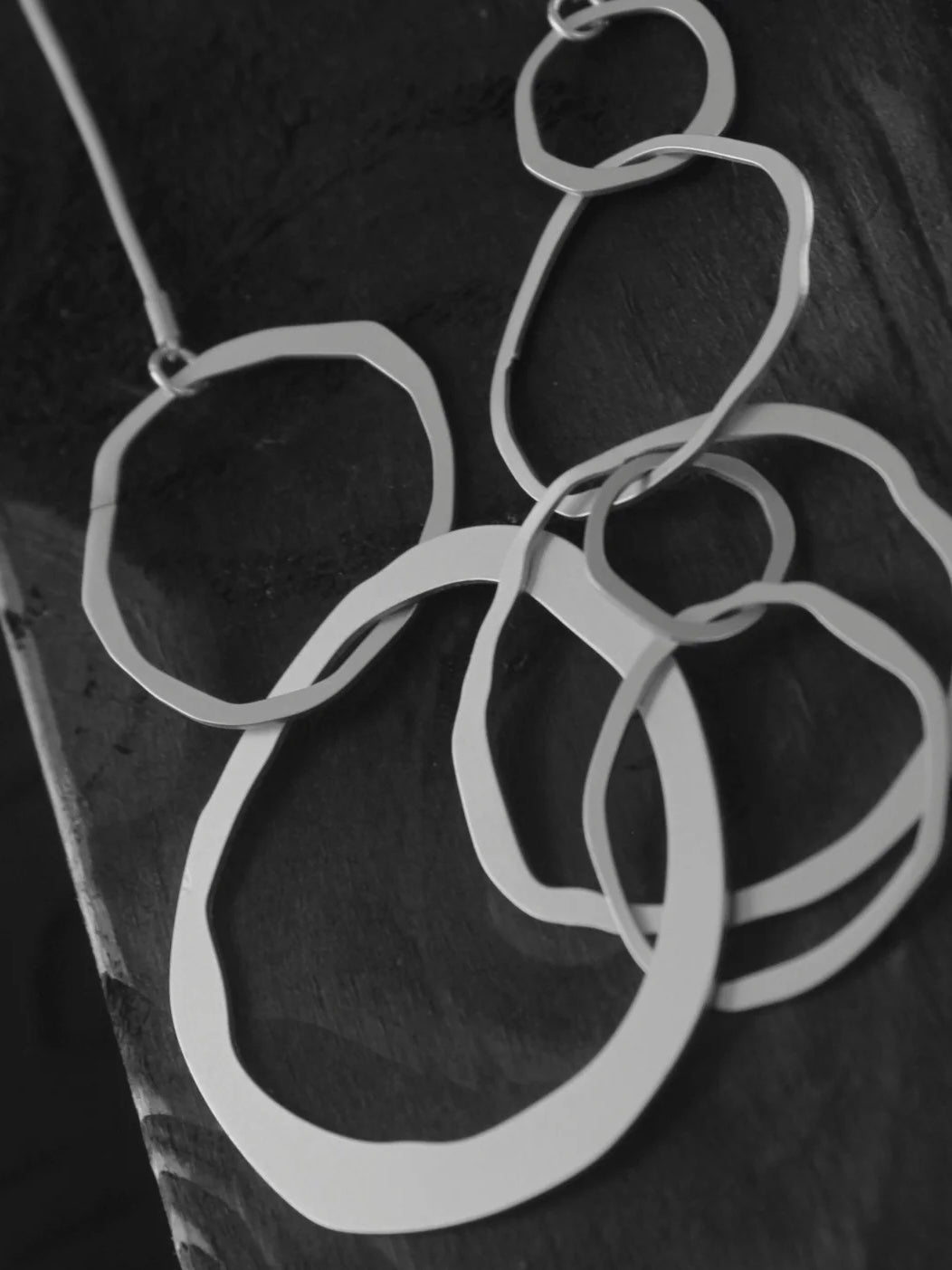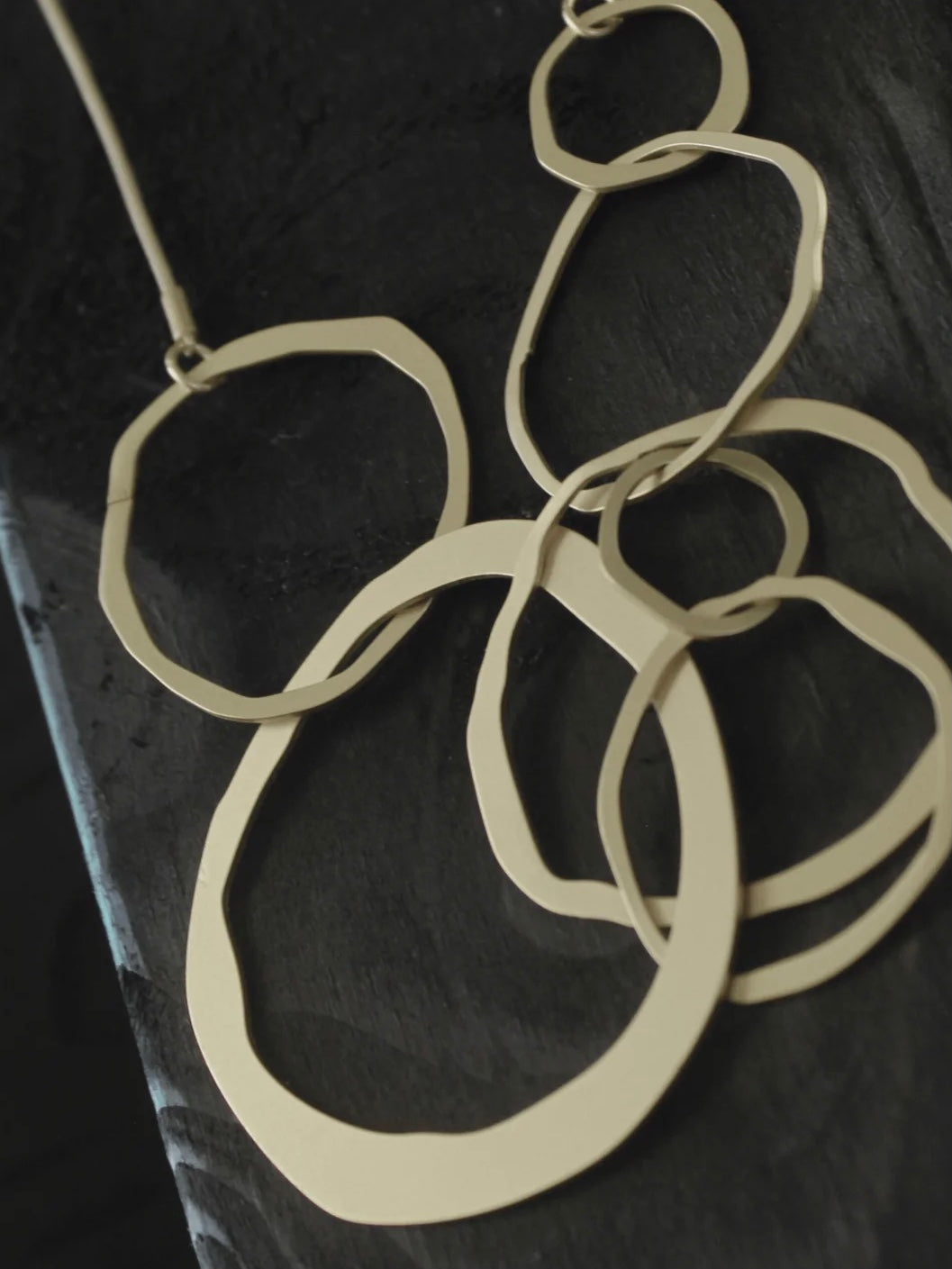 Modische Statementhalskette aus matt versilbertem oder matt vergoldeten Messing. Mit Anhängern in unterschiedlich großen, organisch geformten Ringen an einer Schlangenkette gearbeitet. Variabel in der Länge einstellbar.