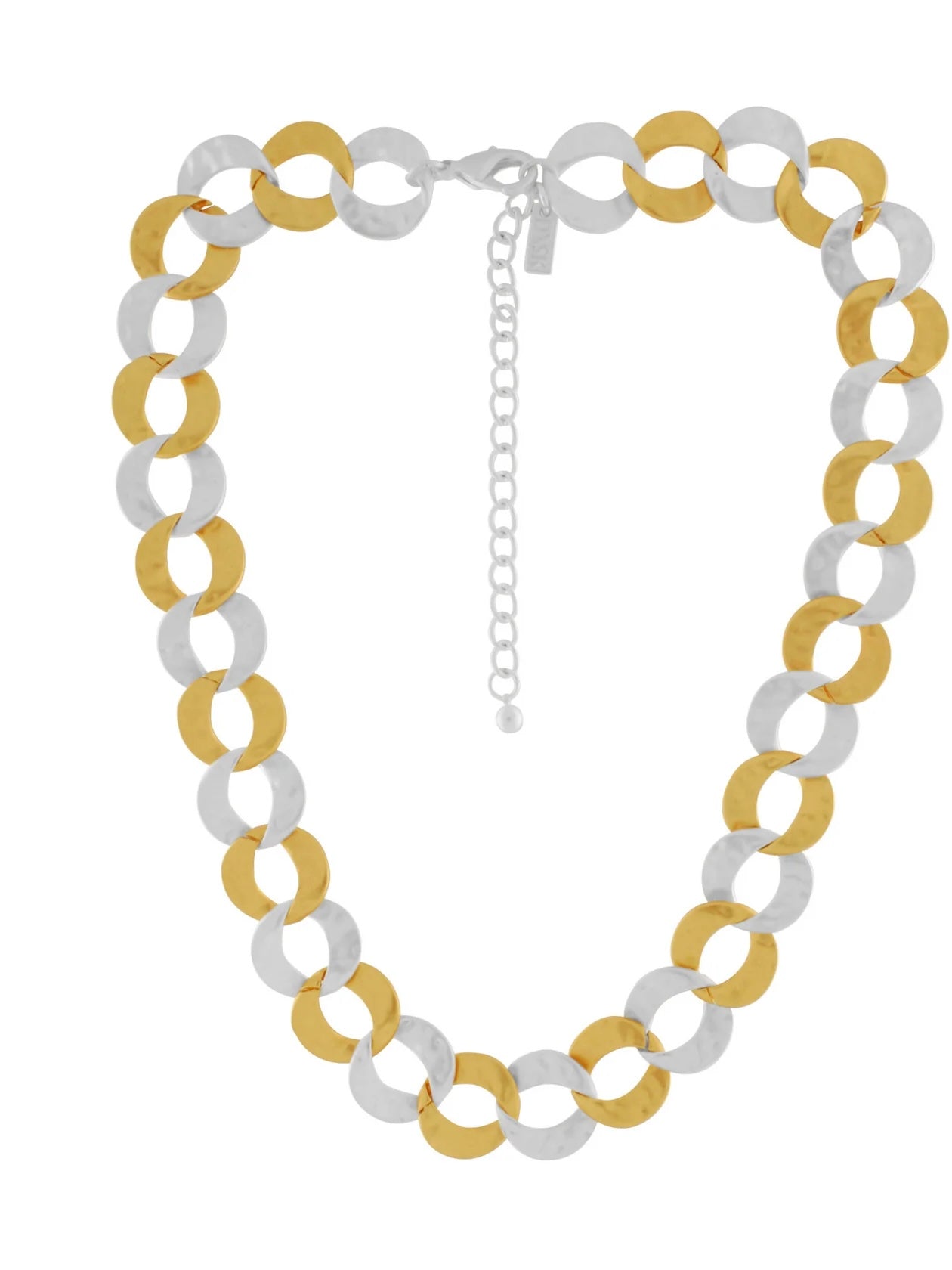 Modische, kurze Halskette aus versilbertem und vergoldeten Messing. Im 2-Ton Design gearbeitet. Variabel in der Länge einstellbar.