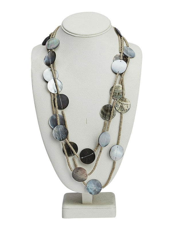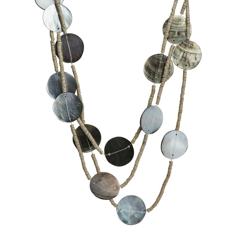 Dekorative Halskette mit runden Muschel- und Kokosnussplättchen, die an 3 Bändern hängen.