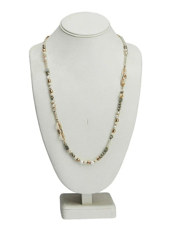 Dekorative Halskette in einem Mix aus Glasperlen und unterschiedlichen Ziersteinen. Auch mit anderen Perlenketten zu kombinieren. Nickelfrei.