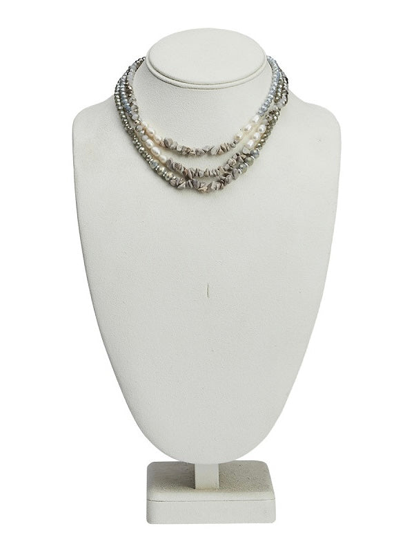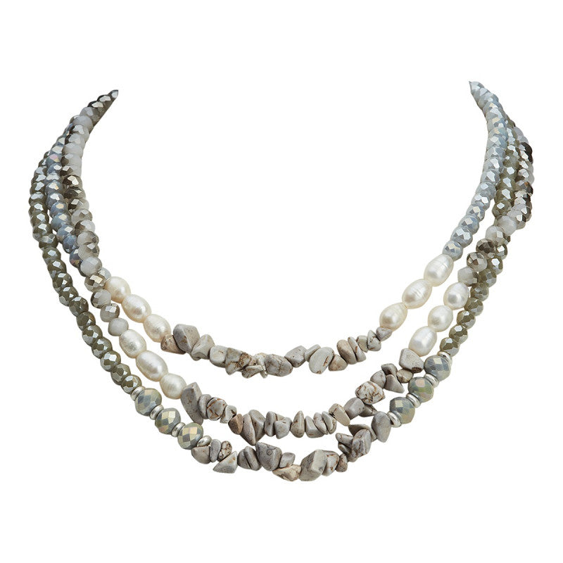 Dekorative Halskette mit 3 Kettensträngen in kurzer Form. Aus unterschiedlichen Schmucksteinen, Glasperlen und Muschellteilchen gefertigt. Nickelfrei. Mit Verlängerungskettchen.