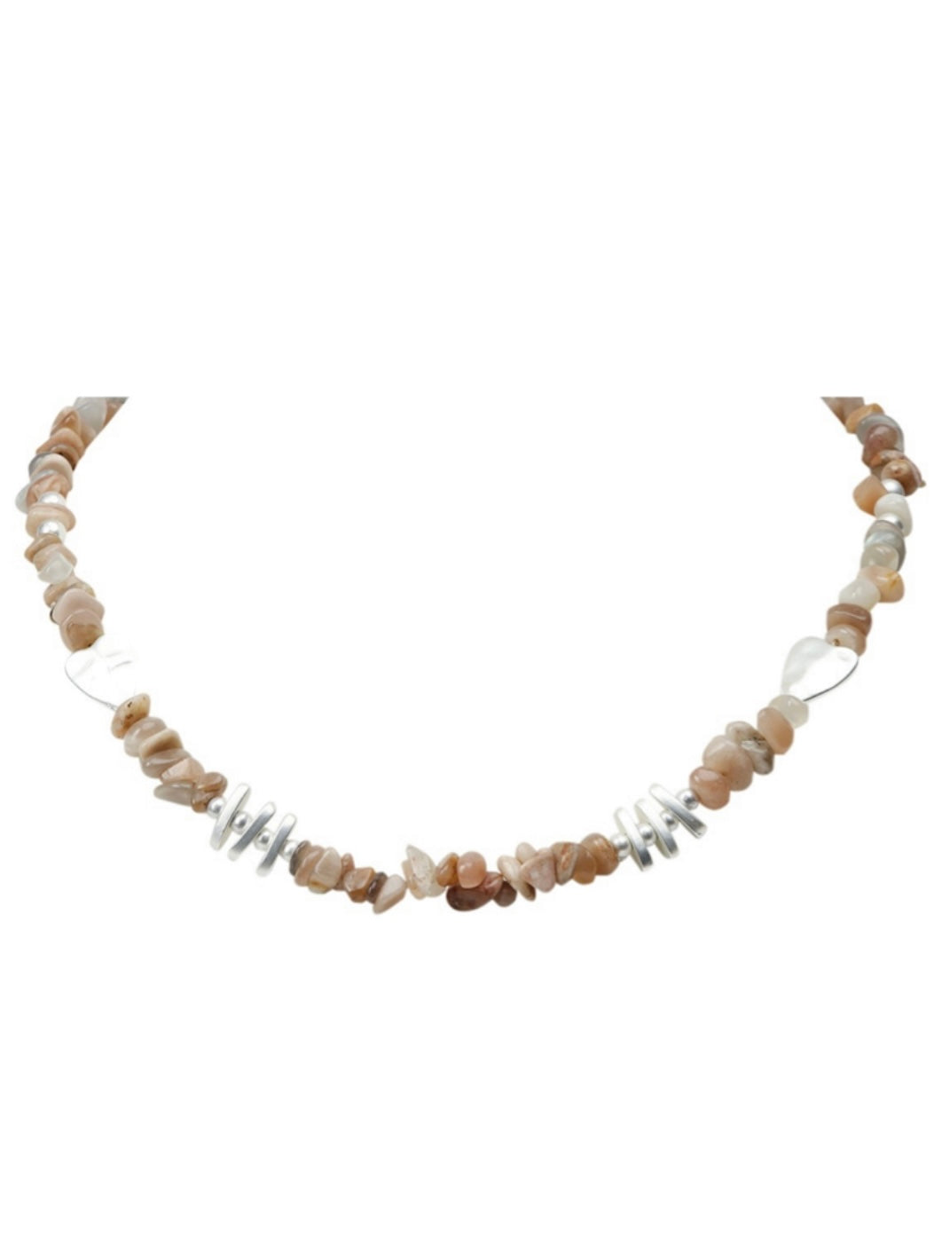 Halskette in kurzer schlichter Form. Aus unterschiedlichen Glasschmucksteine und silberfarbenen Schmuckelementen. Nickelfrei.