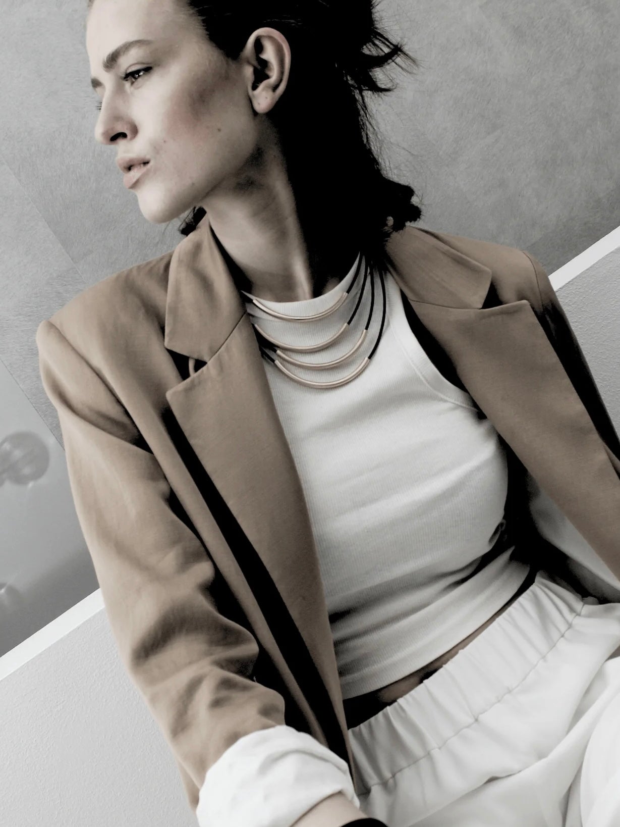 Effektvolle, kurze Halskette aus mehreren Lederbändern die im vorderen Teil mit einem Ring aus versilberten oder vergoldeten Messing umhüllt sind. Mit Verlängerungskettchen und Magnetverschluss.