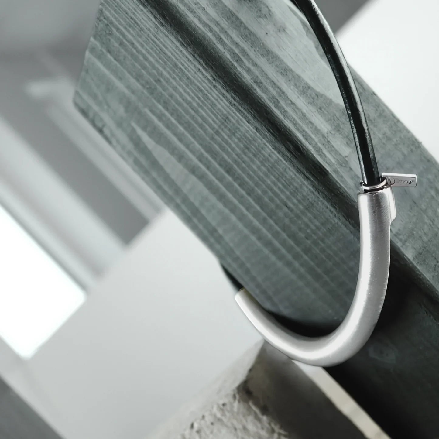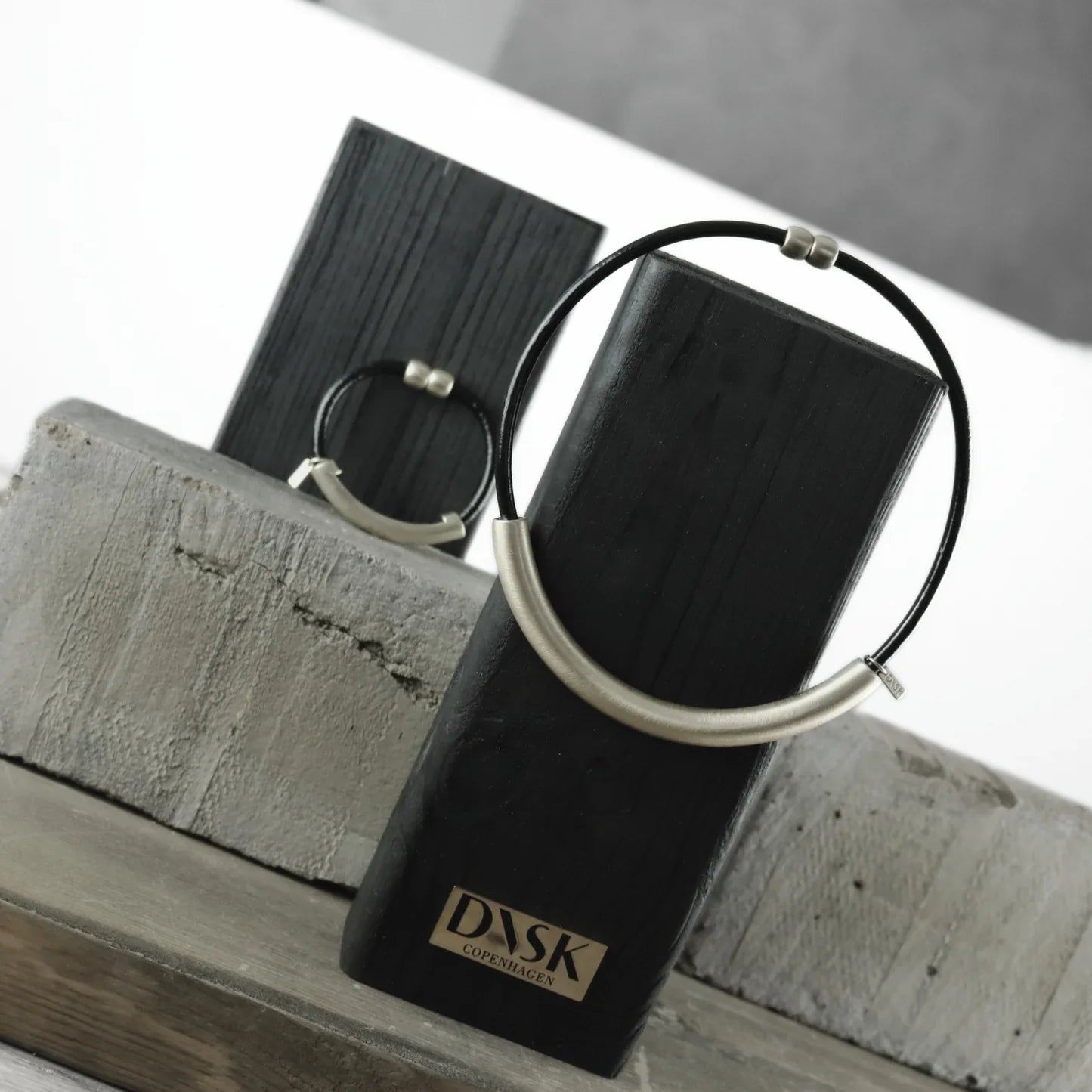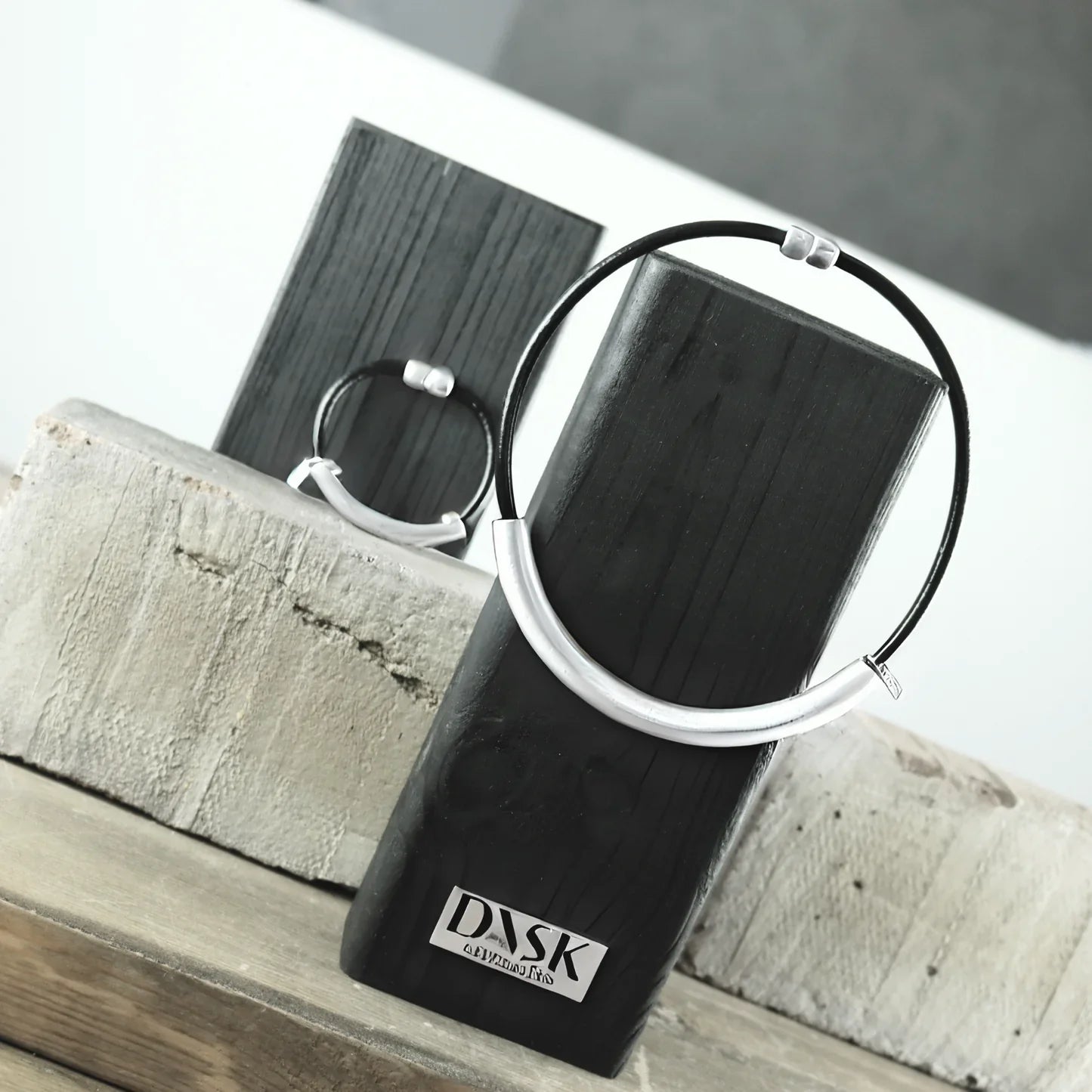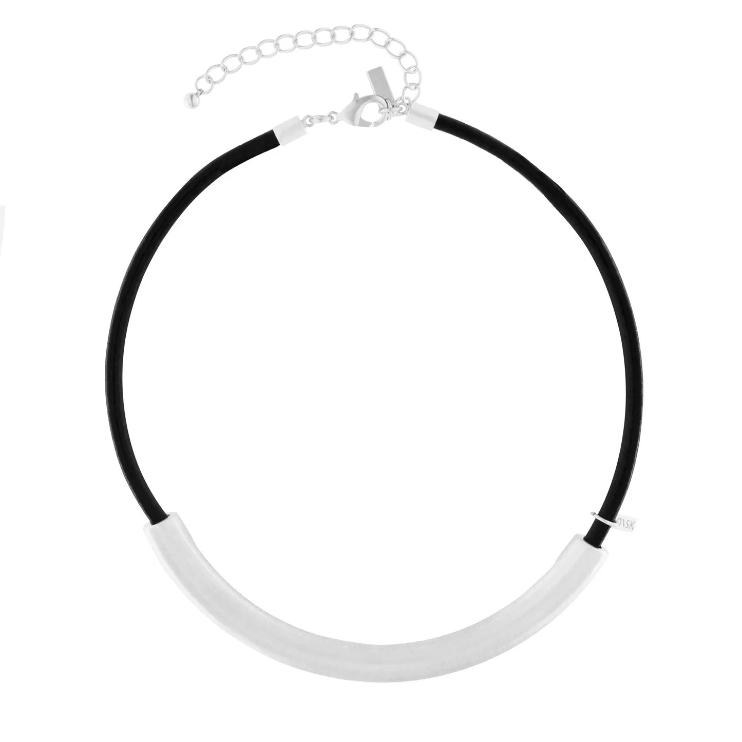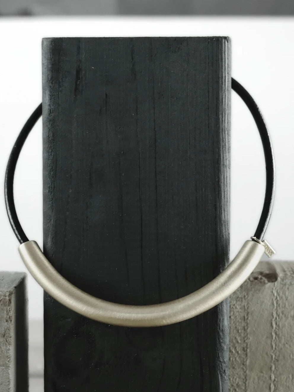 Effektvolle, kurze Halskette aus Leder, im vorderen Teil mit einem Ring aus versilberten oder vergoldeten Messing umhüllt. Mit Verlängerungskettchen und Magnetverschluss.