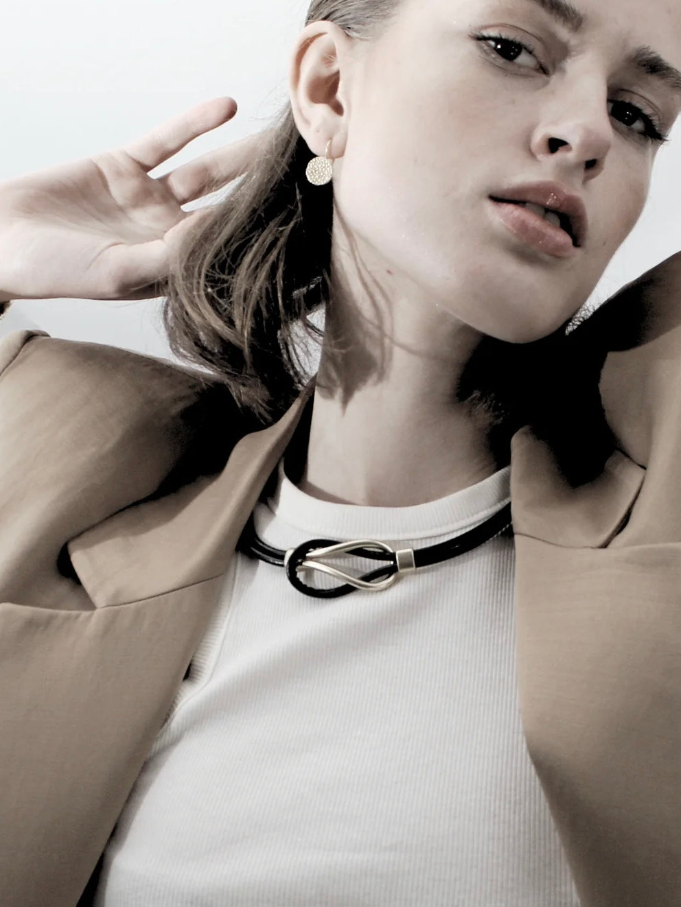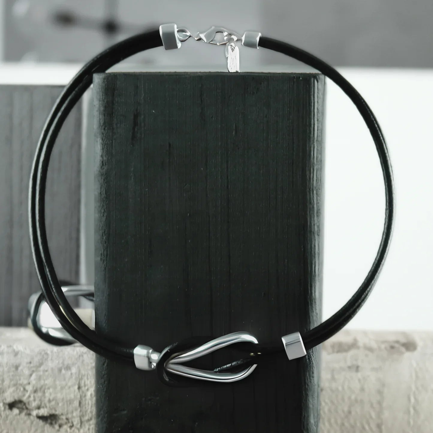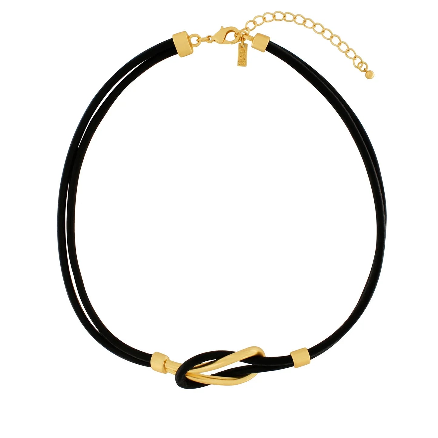 Effektvolle, kurze Halskette aus Leder, im vorderen Teil mit einem Knoten aus versilberten oder vergoldeten Messing verarbeitet. Mit Verlängerungskettchen und Magnetverschluss.