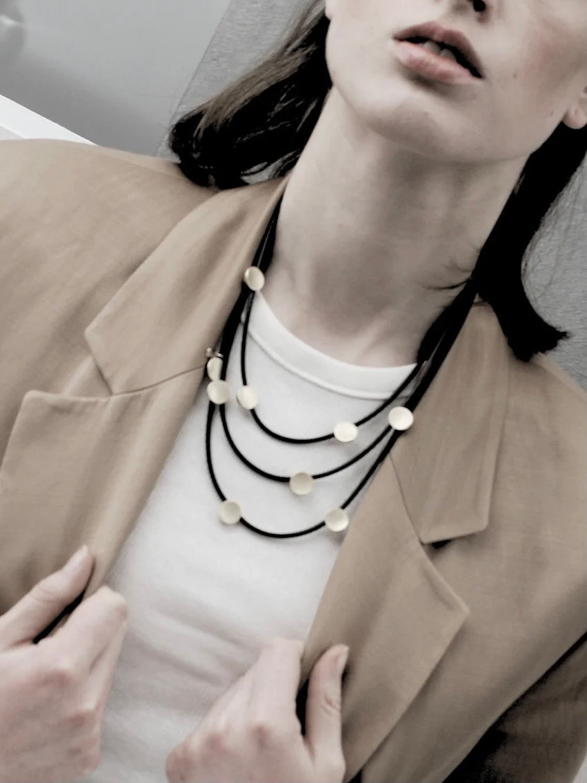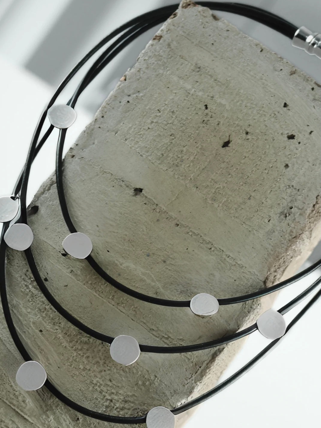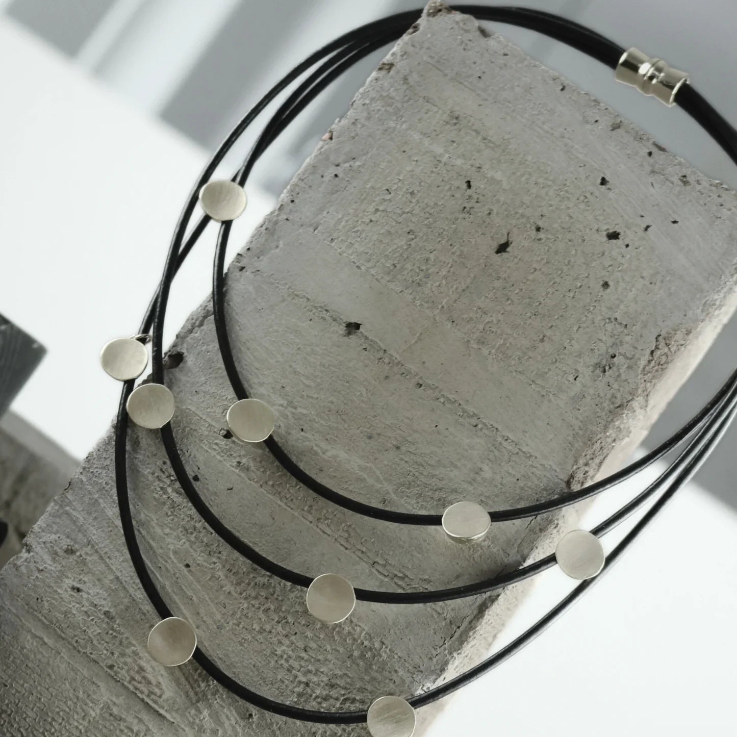 Effektvolle, kurze Halskette aus Leder. Aus mehreren Bändchen gearbeitet, die mit mehreren schraffierten Plättchen aus versilbertem oder vergoldetem Messing verziert sind. Mit Verlängerungskettchen und Magnetverschluss.