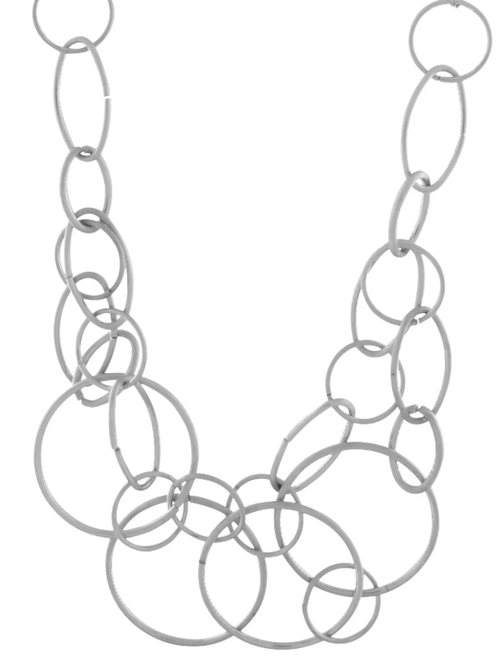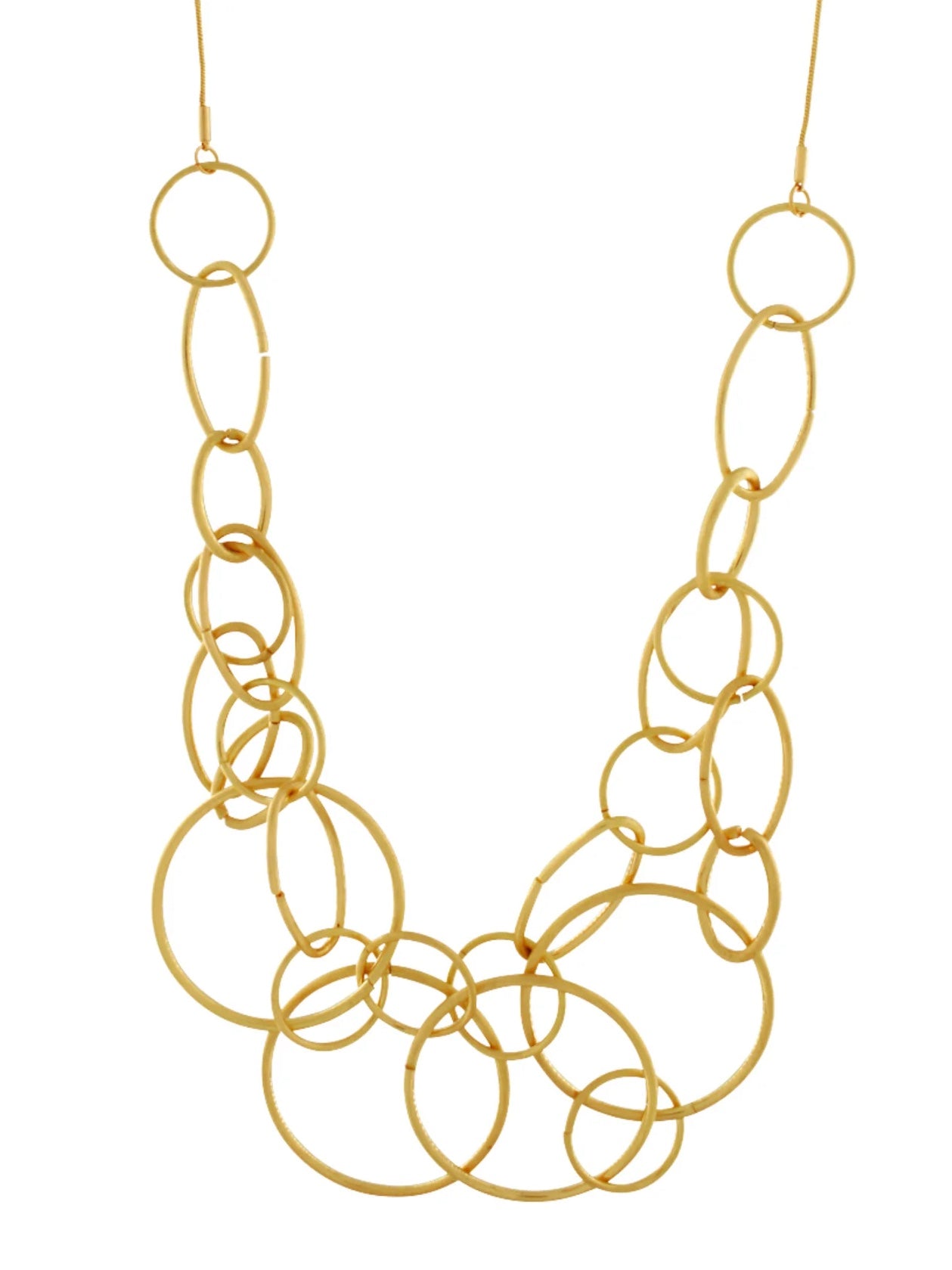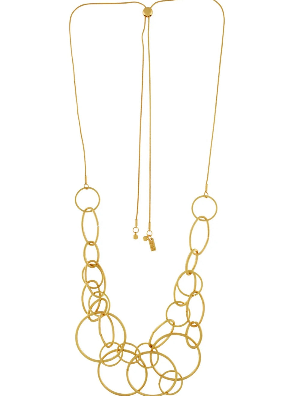 Effektvolle Halskette mit matt vergoldeten oder matt versilberten Kupferringen in unterschiedlichen Größen, die als Anhänger von einer matt vergoldeten oder matt versilberten Kette gehalten werden. Variabel in der Länge einstellbar.