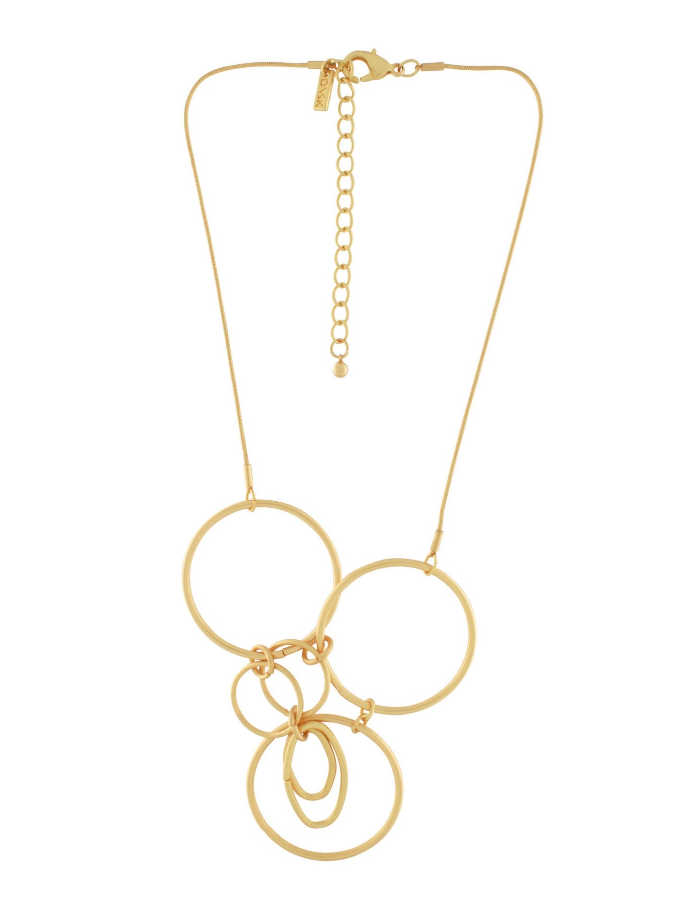 Effektvolle Halskette mit matt vergoldeten oder matt versilberten Kupferringen in unterschiedlichen Größen, die als Anhänger von einer matt vergoldeten oder matt versilberten Kette gehalten werden. Variabel in der Länge einstellbar.