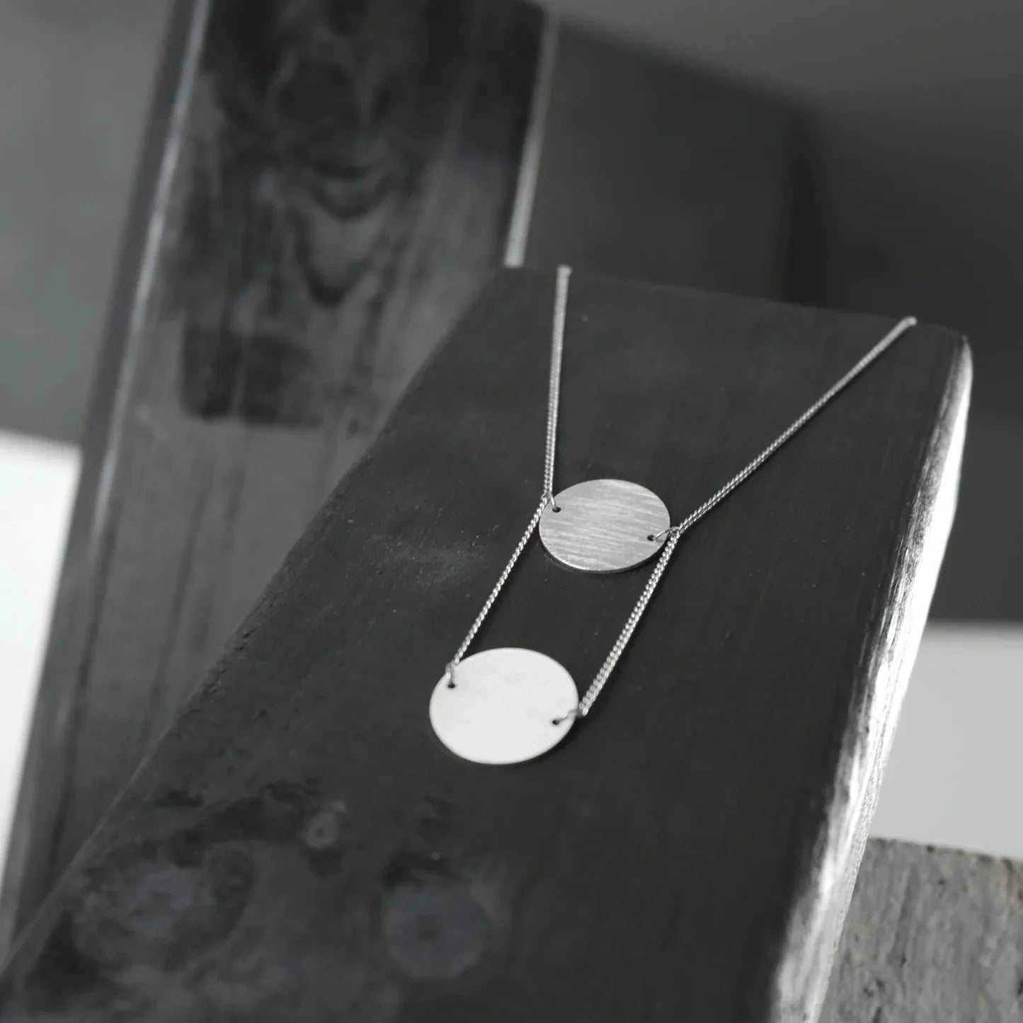 Effektvolle Halskette mit 2 matt vergoldeten oder versilberten Anhängern mit gebürsteter Oberfläche. Variabel in der Länge einstellbar.