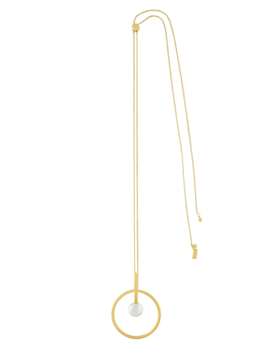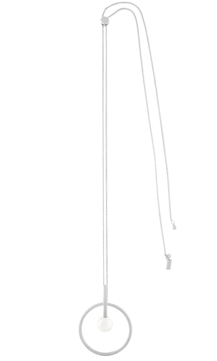 Modische Halskette mit einem Anhänger in Form eines offenen Rings mit einem kleinen Plättchen in der Mitte. An einer in der Länge verstellbaren Schlangenkette gearbeitet.