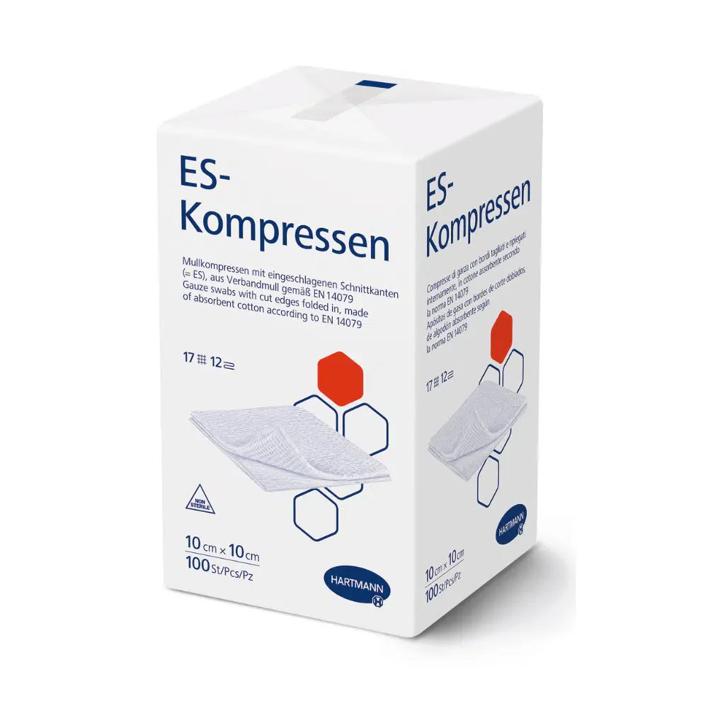 Hartmann ES-Kompressen zur allgemeinen Wundversorgung, insbesondere zur Erstversorgung von verschmutzten, infizierten und stark sezernierenden Wunden; als Tupfer und als Kompressen bei kleineren operativen Eingriffen. Die Kompresse kann mehrfach aufgeklappt und somit in unterschiedlichen Formaten verwendet werden, ohne dass störende Randfäden entstehen. Die Wundkompresse bietet eine ideale Saugfähigkeit, ist luftdurchlässig, weich sowie geschmeidig zur Haut.