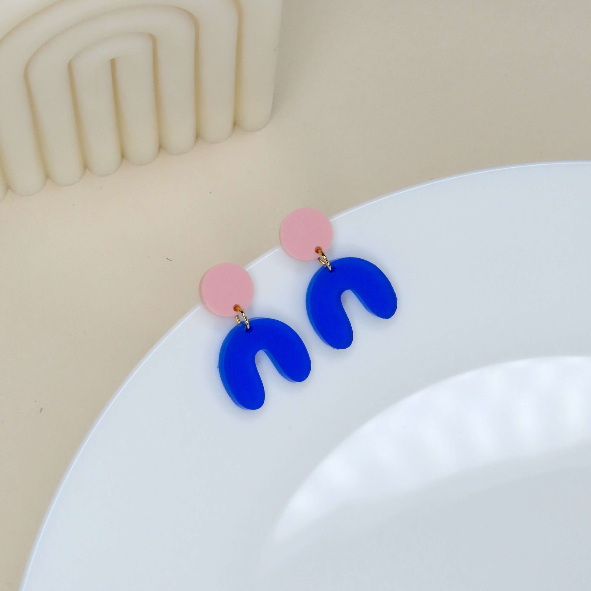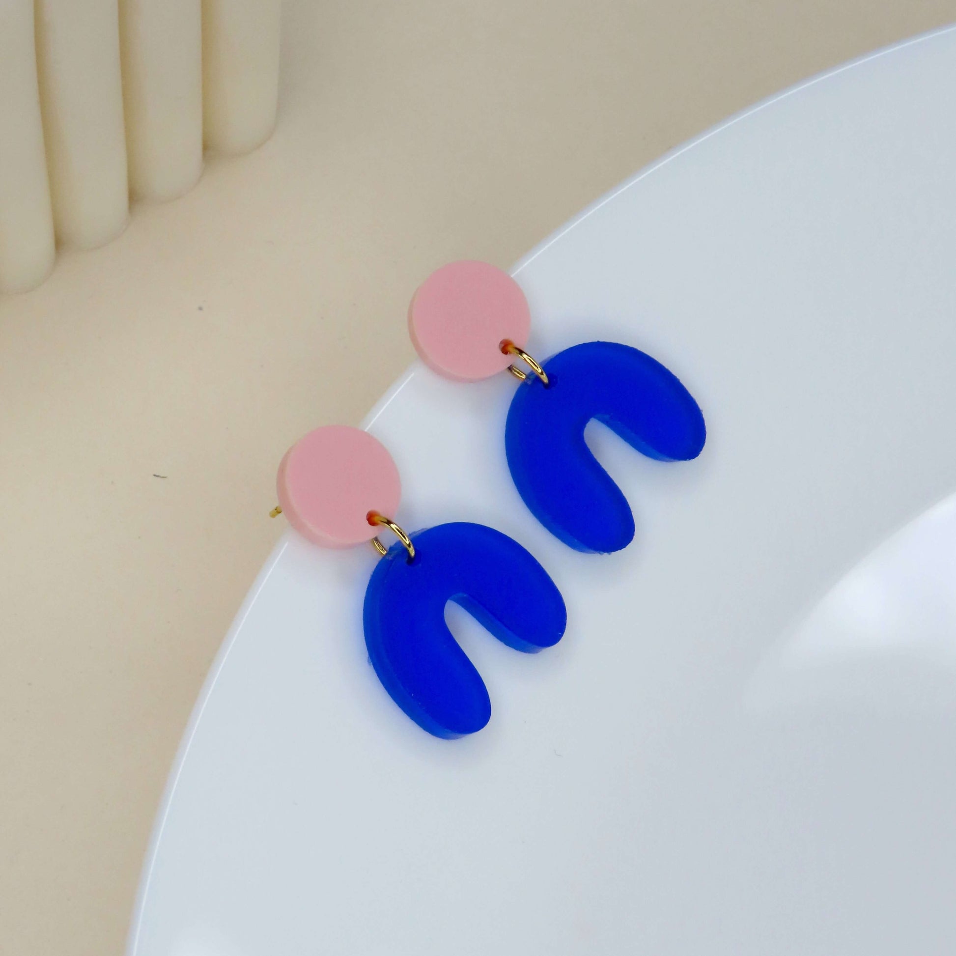 Die zarten rosa Stecker bringen Leichtigkeit, während das satte Blau der Anhänger echtes Statement-Potenzial mitbringt. Die Bogenform wirkt weich und organisch – fast wie ein kleines Kunstwerk fürs Ohr.