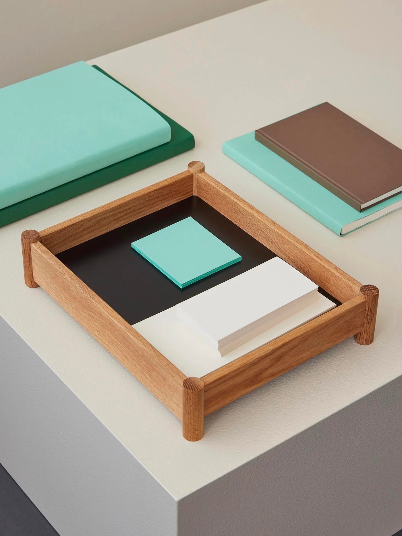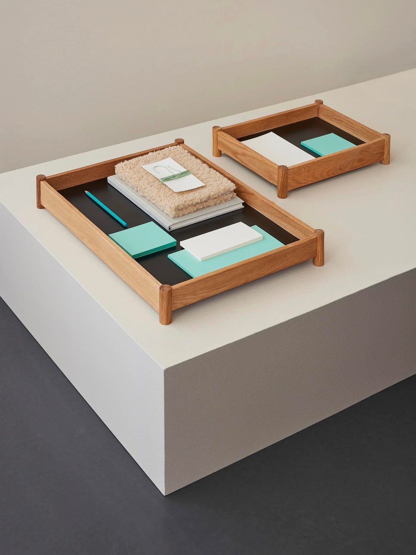 Schönes Serviertablett in schlichtem dänischen Design aus Eichenholz mit schwarzem Furnierboden. Auch als Ablage für Schlüssel oder im Bad zu nutzen. In 2 Größen erhältlich.