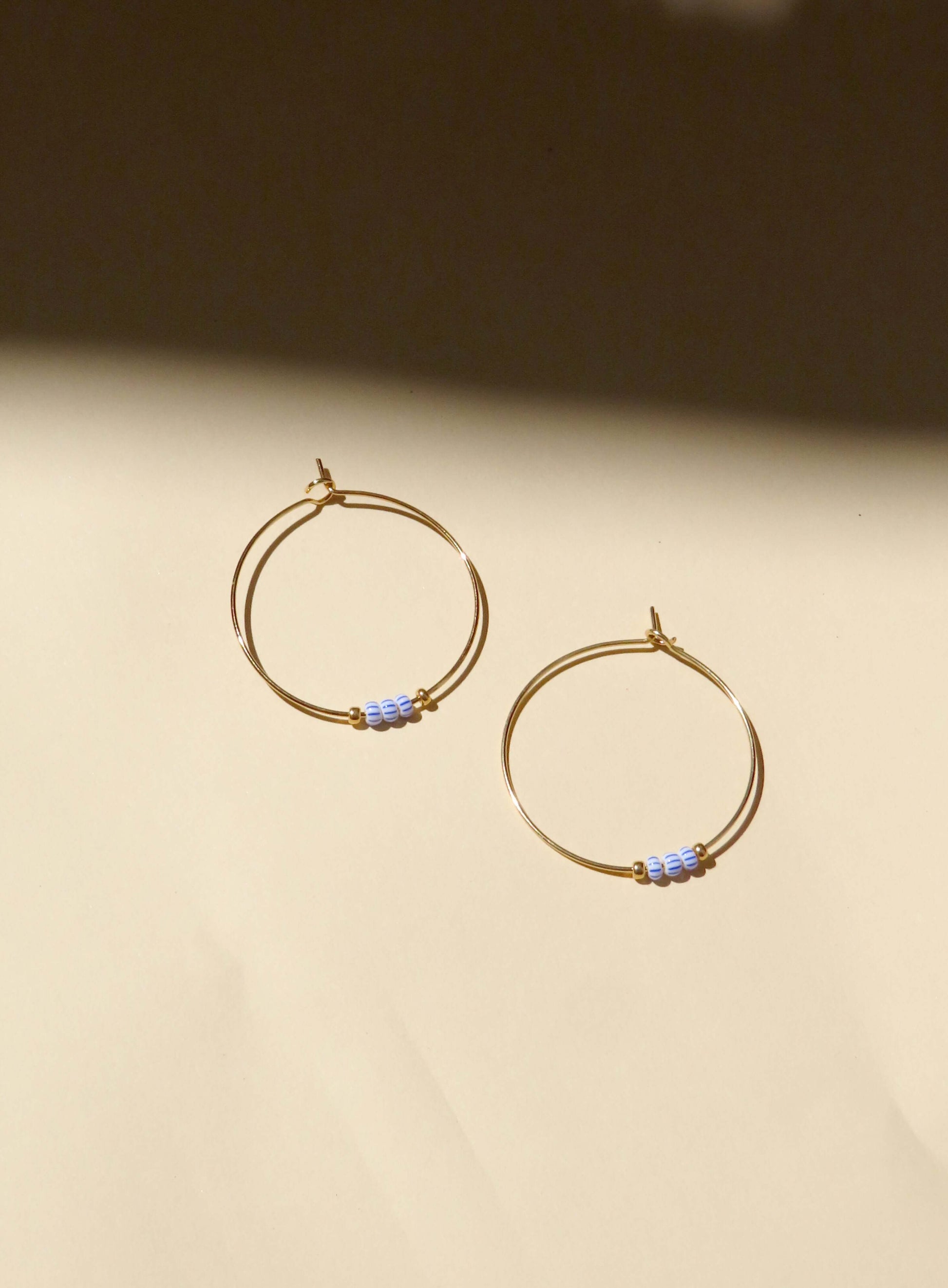 Verwendet haben wir gut verträgliche Edelstahl Creolen und Rocailles Perlen aus Glas.