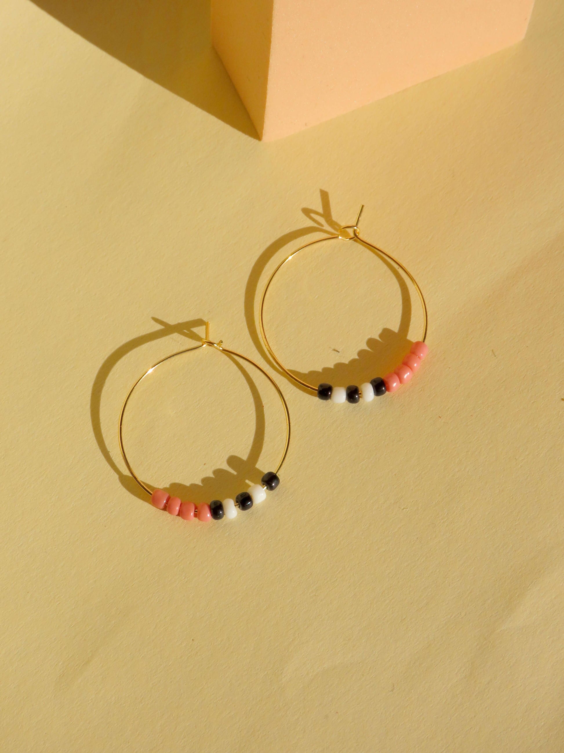 Verwendet haben wir gut verträgliche Edelstahl Creolen (vergoldet) und Seed Perlen aus Glas in altrosa/schwarz/weiss.