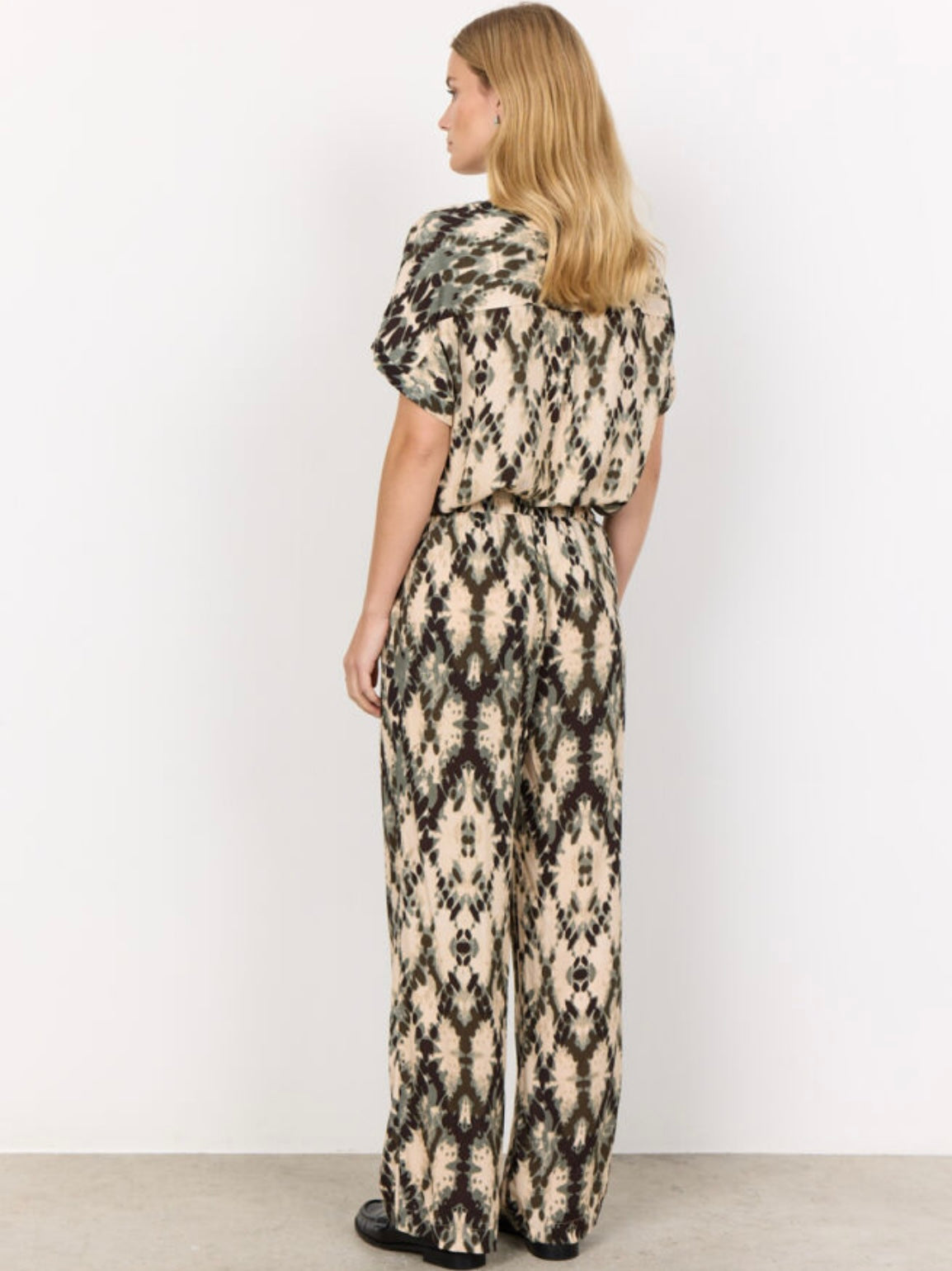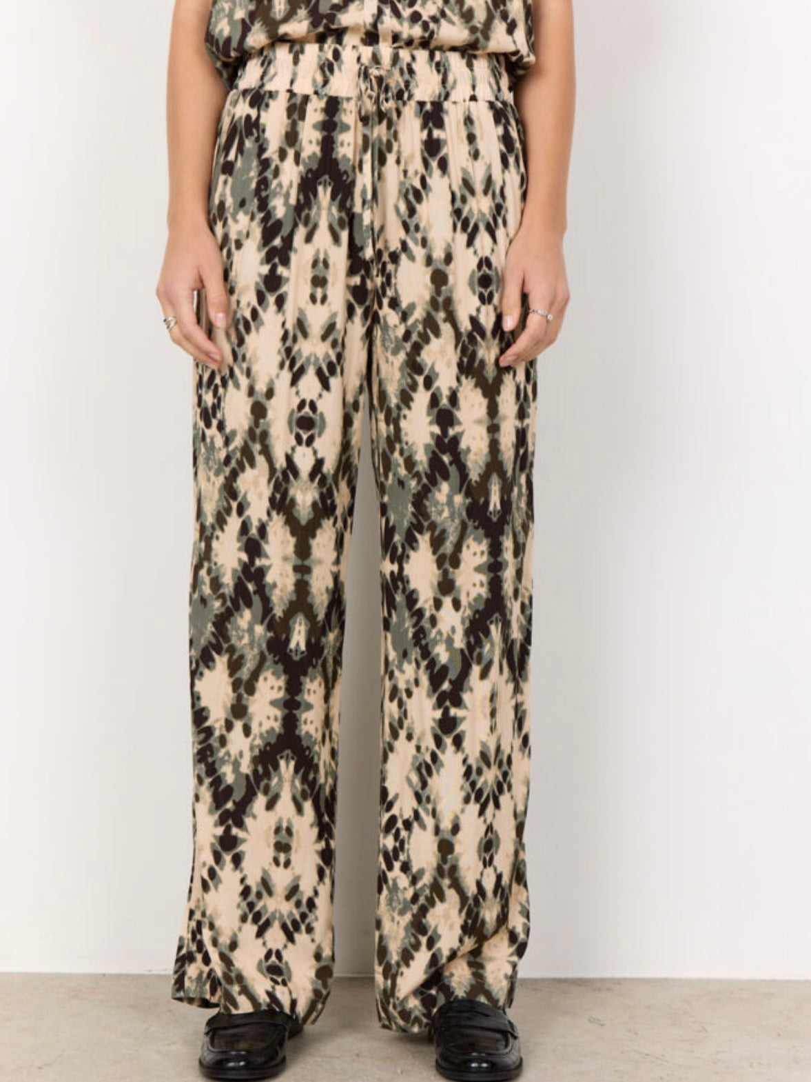 Lässige Hose im Palazzo Stil mit weiten Beinen. Fließende Viskose in einem modischen Fantasieprint. Seitliche Eingrifftaschen und angesetztes glattes Bündchen mit Gummizug. Vorn zu binden. Sowohl in der Freizeit als auch ins Büro zu tragen.
