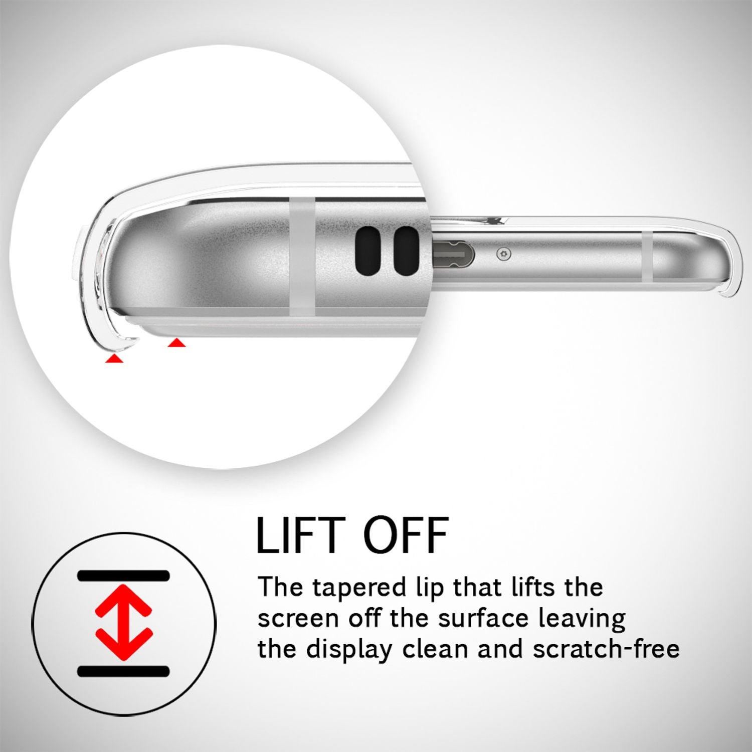 Der Rahmen des Cases ragt etwas über das Display hinaus, wodurch dieses nicht auf Oberflächen aufliegt. Das hält Ihr Display sauber und kratzfrei