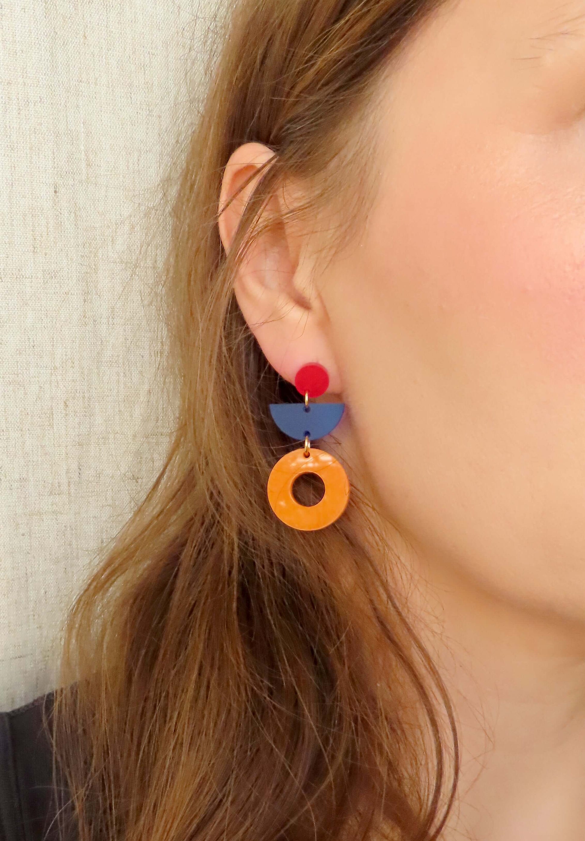 Manchmal braucht es nur ein kleines Detail, um dein Outfit auf das nächste Level zu bringen – wie diese besonderen Ohrringe! Die Kombination aus orangen Ringen, blauen Halbkreisen und roten Punkten spielt mit Farben und Formen auf eine charmant verspielte Weise.