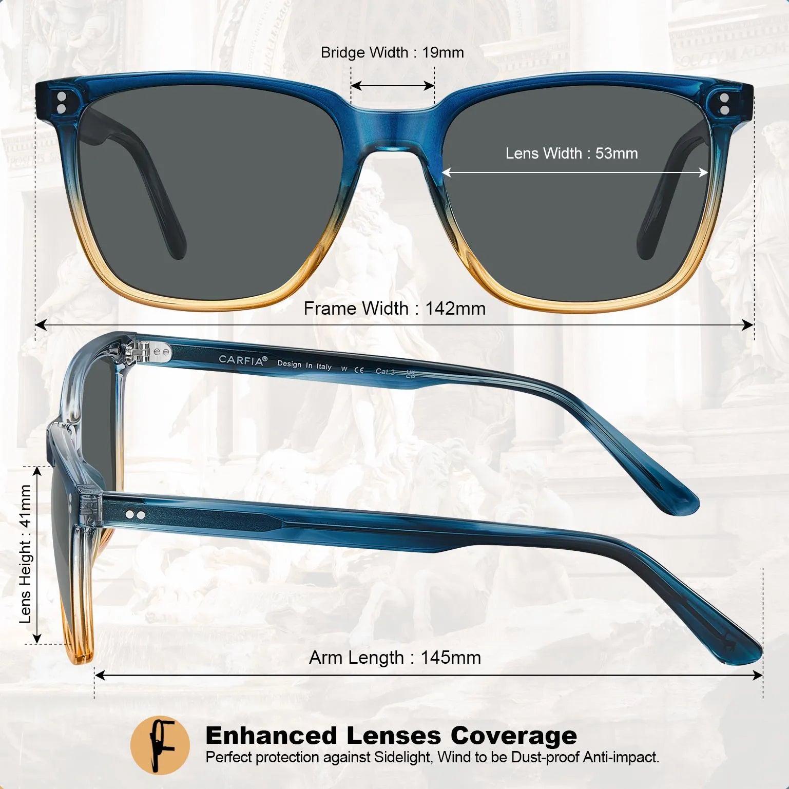 - A modern interpretation of vintage design - With sleek contours for an active lifestyle, CARFIA round men's sunglasses are well-compatible with everyday clothes and can be the perfect decoration. Product Size - Lens width: 53 mm, Lens height: 41 mm, Bridge: 19 mm, Arm: 145 mm, Frame width: 142 mm.