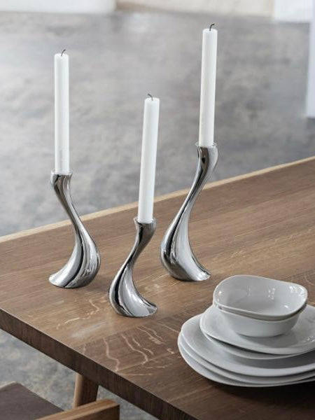 Dieser Kerzenhalter ist mit seiner imponierenden Silberform sehr klassisch und wegen des beeindruckend schwingenden Körpers dennoch originell. So, wie er sich emporstreckt, scheint er die Erdanziehungskraft zu überwinden. Mit seiner Namensvetterin hat er viel gemeinsam: Er ist imposant, voluminös und eindrucksvoll.
