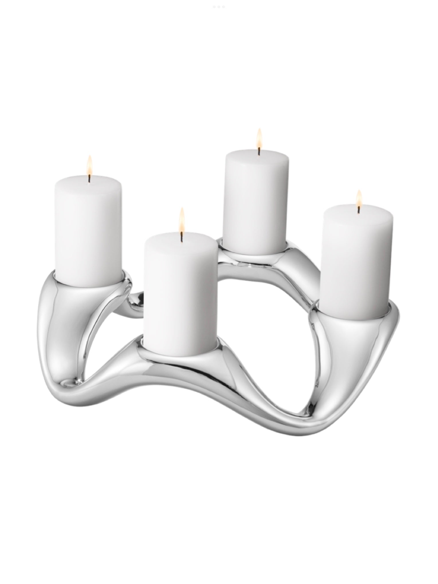 Dieser skulpturale Leuchter aus Edelstahl ist voller fließender Bewegung und ein markanter Tischschmuck, insbesondere wenn das Kerzenlicht auf der sanft gewellten, glänzenden Oberfläche reflektiert wird. Er trägt vier Stumpenkerzen und ist perfekt für die Adventszeit, aber dezent genug für das ganze Jahr.