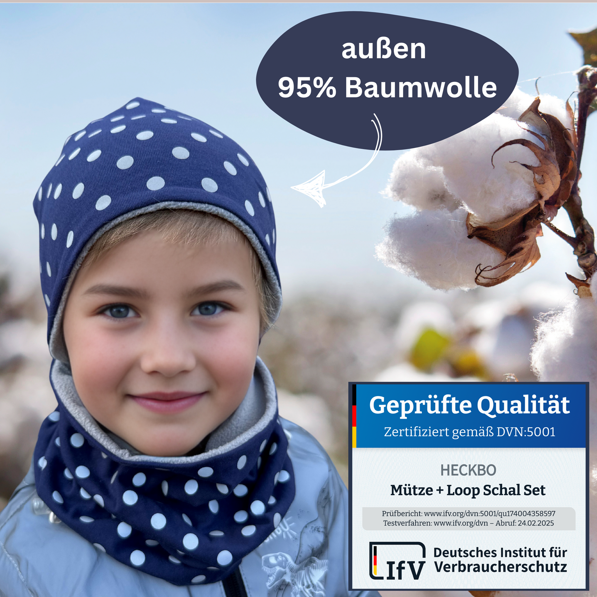 Dank der dehnbaren Materialkombination aus 95 % Baumwolle und 5 % Elasthan passt sich das Set ideal an einen Kopfumfang von ca. 48–54 cm an – perfekt für die Übergangszeit.