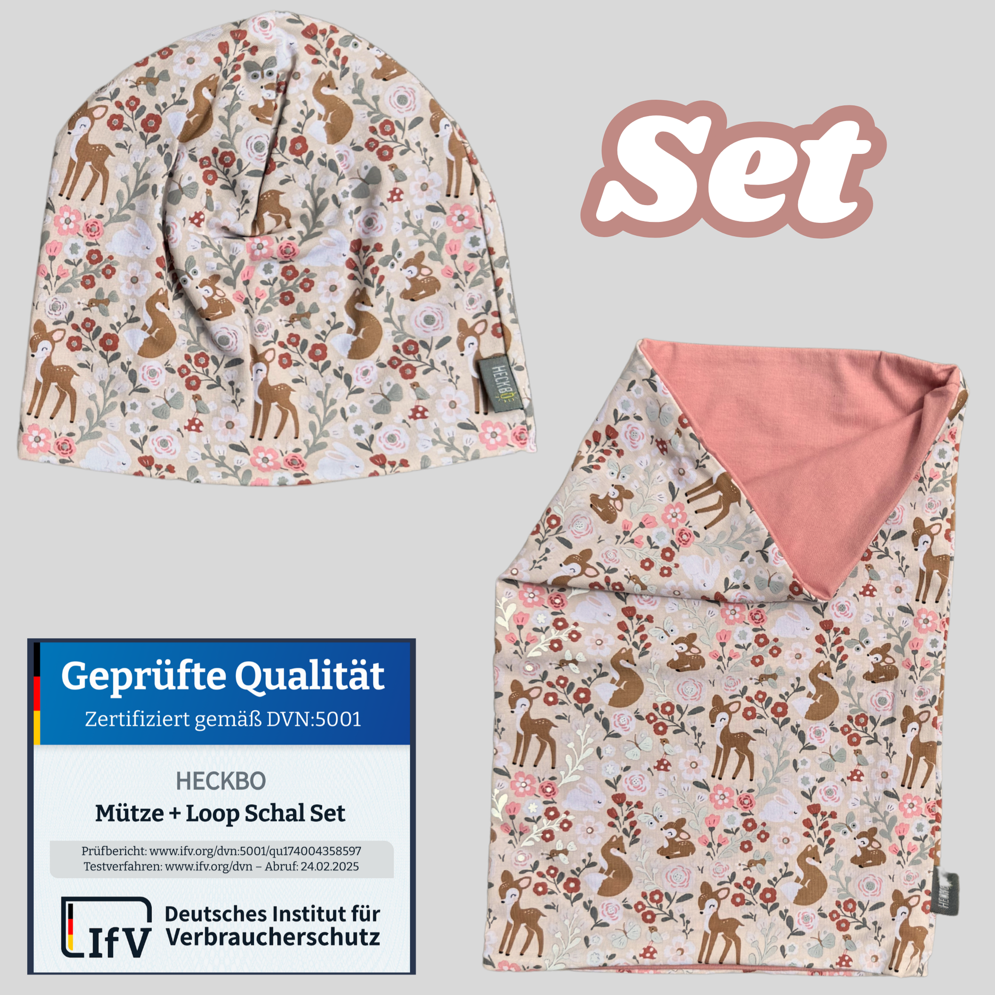 Das zweiteilige HECKBO Set besteht aus einer weichen Mütze und einem farblich passenden Loop-Schal mit zauberhaftem Waldtiere-Motiv. Reflektierende Details sorgen für einen stylischen Look und mehr Sicherheit im Alltag.