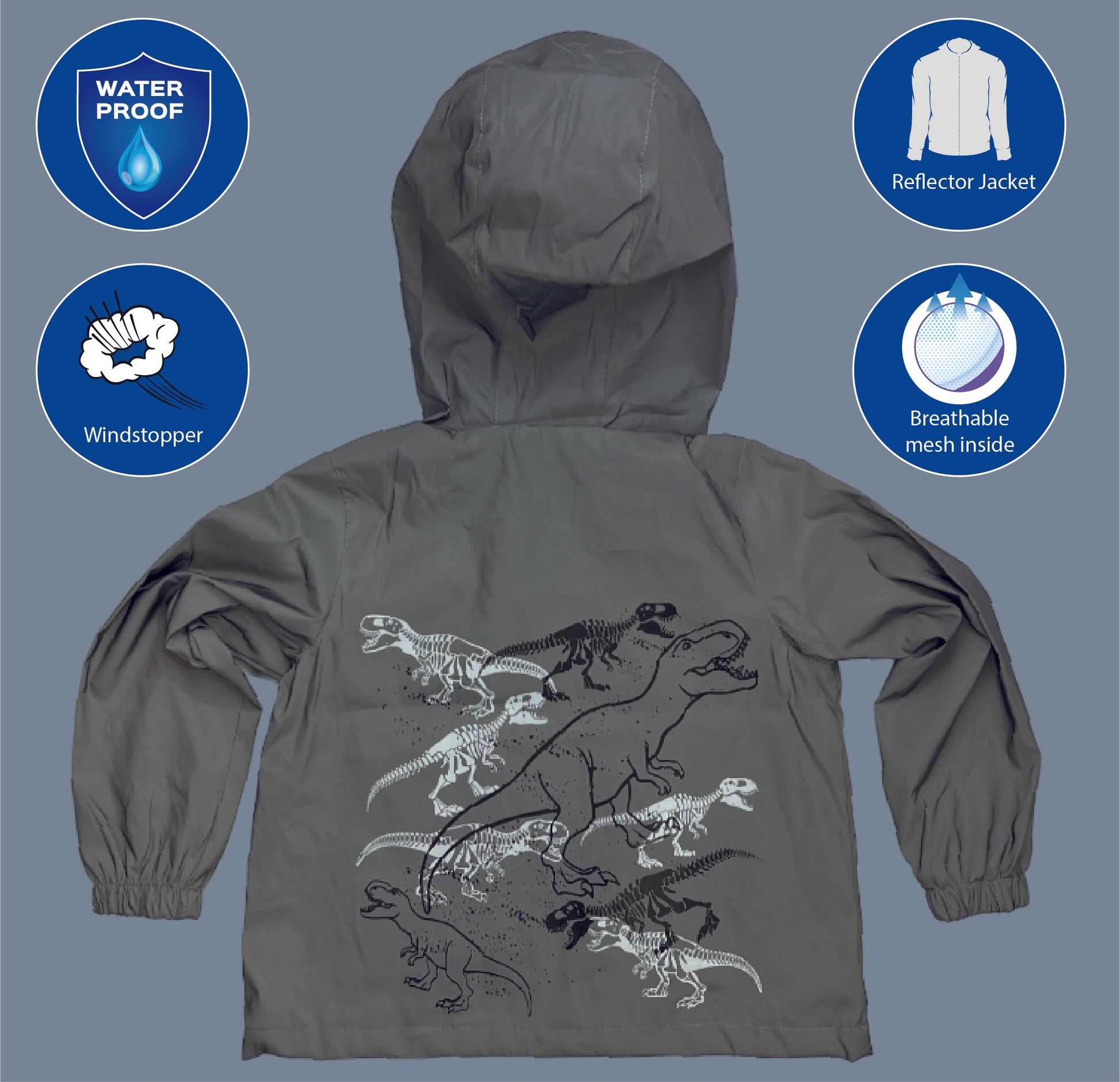 🦕 DESIGN: Stylische HECKBO Wind- und Regenjacke mit coolem Dinosaurier-Motiv auf Brust und Rücken – ein echter Hingucker für kleine Dino-Fans.