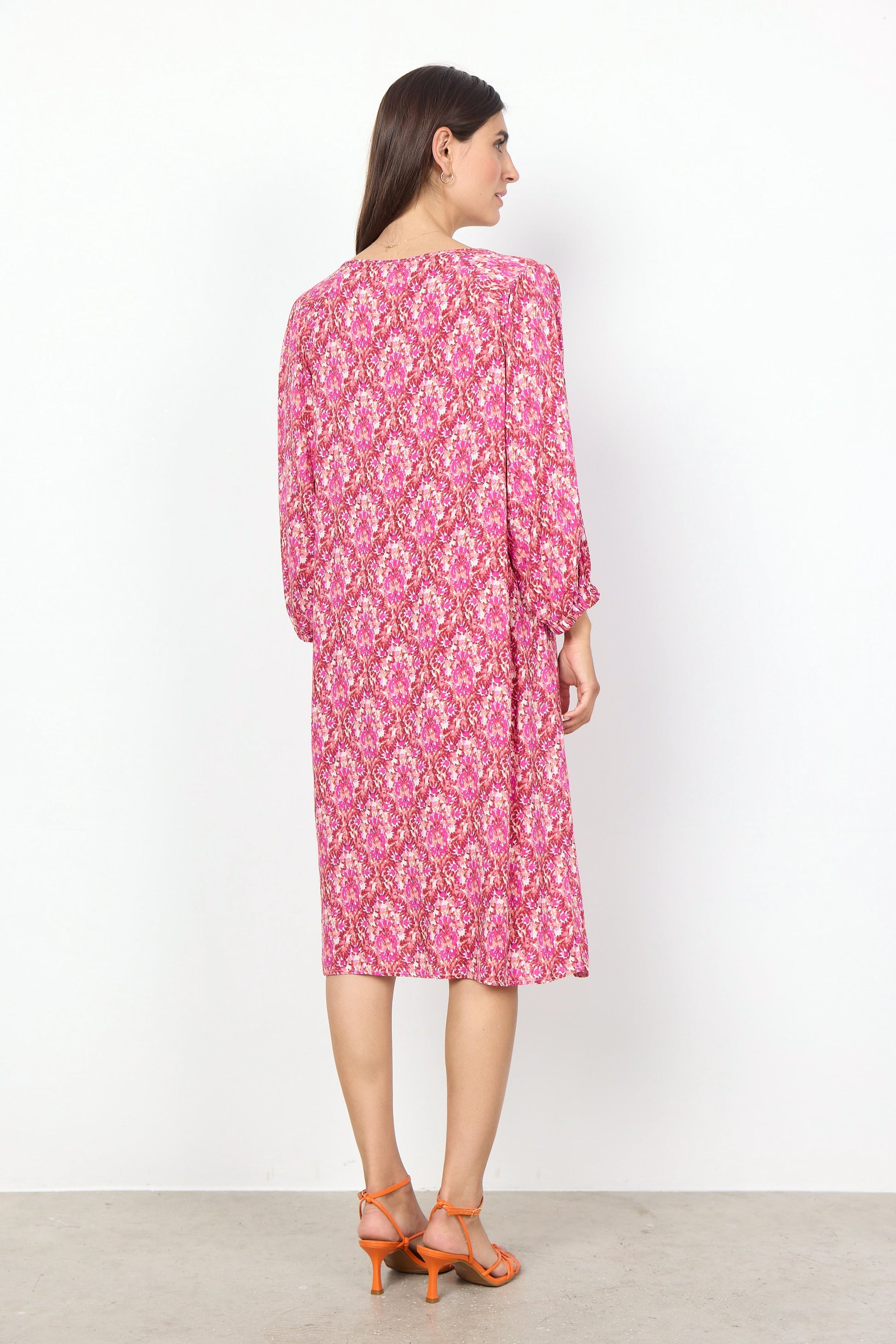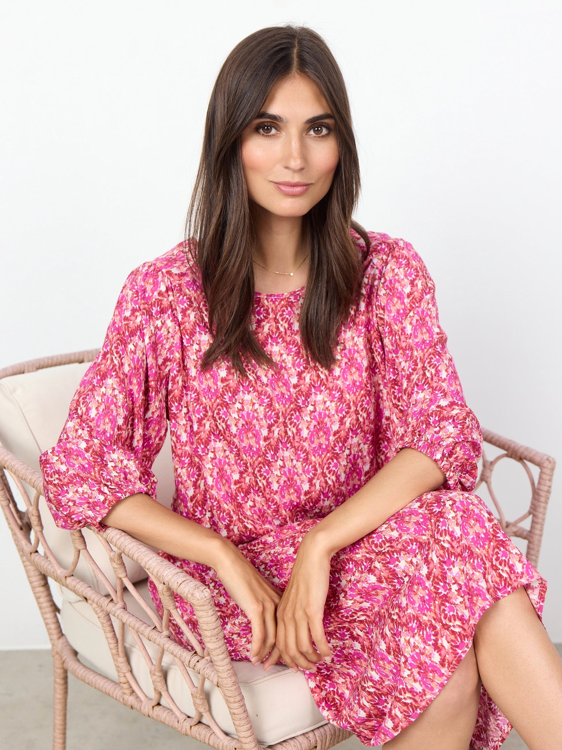 Modisches Kleid mit femininem Fantasiedruck in kniebedeckender Länge. Mit rundem Ausschnitt und langen Ärmeln mit Gummizug am Bündchen gearbeitet. Weite Form.