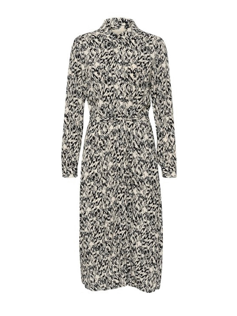 Wadenlanges, durchgeknöpftes Hemdblusenkleid in einem schwarz/creme Fantasiemuster. Ab Taille ist der Rockteil weiter ausgestellt, ein Bindegürtel wird mitgeliefert. Mit langen Ärmeln gearbeitet. Aus einer leichten Viskosequalität gefertigt.