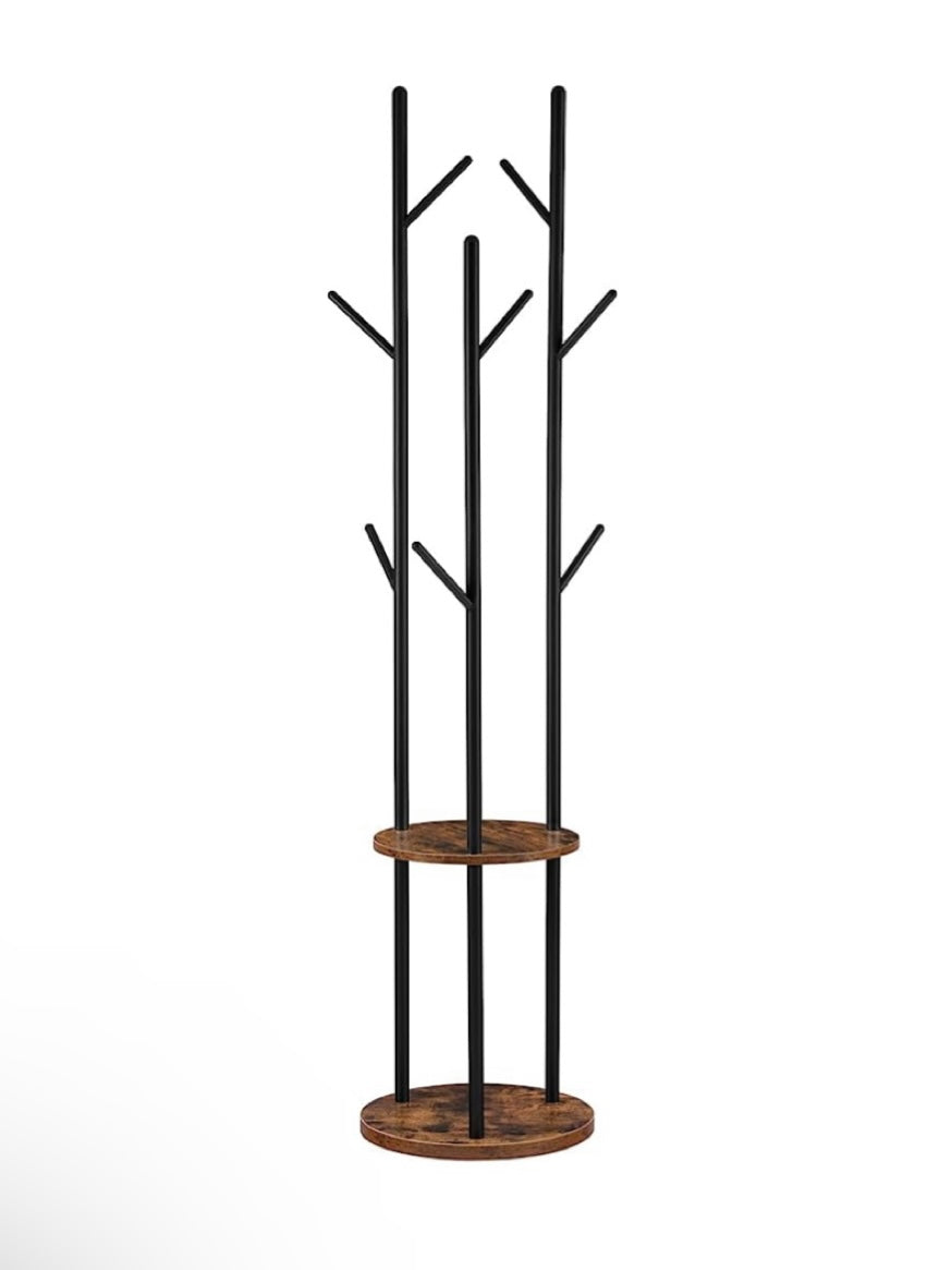 Delorativer Kleiderständer aus geschwärztem Eisen. Vielseitig einsetzbar im Flur oder Schlafzimmer. Minimalistisches Design in hochwertiger Verarbeitung. Mit 2 runden Ablageflächen für Taschen oder Hüte.