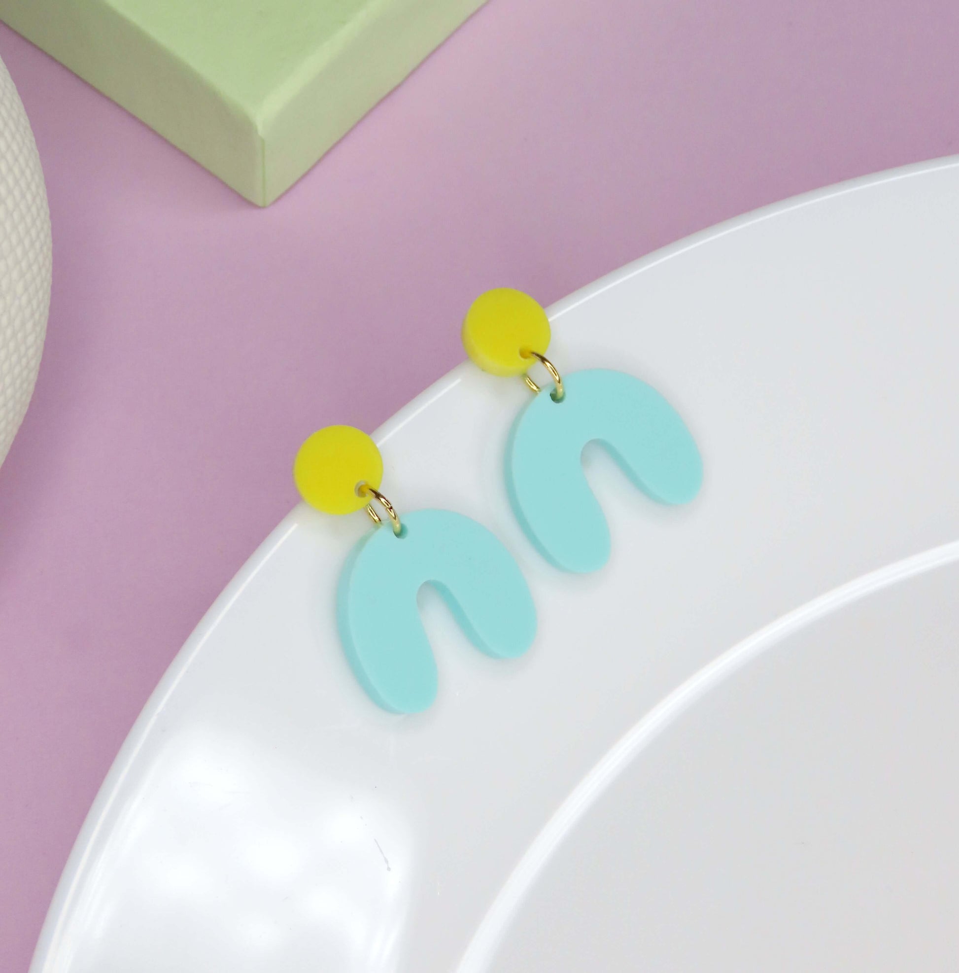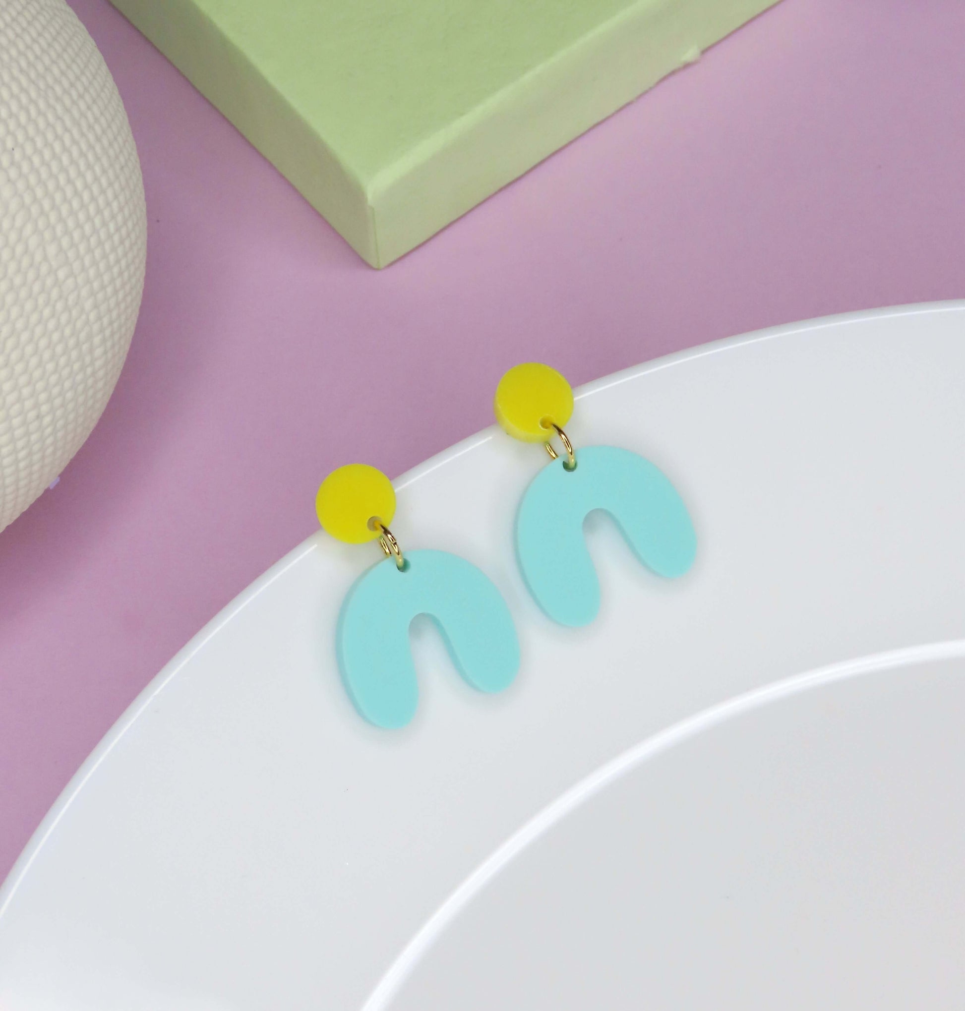 Ein runder Stecker in strahlendem Gelb bildet den Anfang – er wirkt wie ein kleiner Sonnenstrahl am Ohr und setzt direkt einen fröhlichen Akzent. Daran hängt ein geschwungener Anhänger in kräftigem Türkis – in einer offenen, bogenförmigen Form, die wie ein sanftes „U“ wirkt.