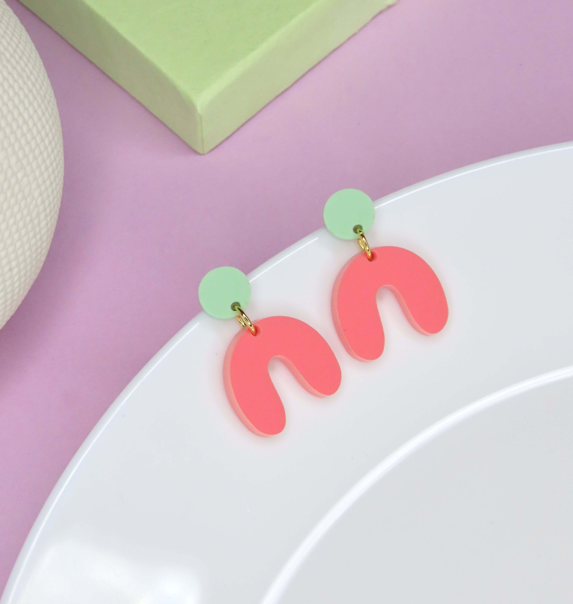 Du suchst nach einem besonderen Farbtupfer? Diese Ohrringe vereinen die Leichtigkeit von Pastellgrün mit dem frischen Erdbeerrot in einer klaren Bogenform.