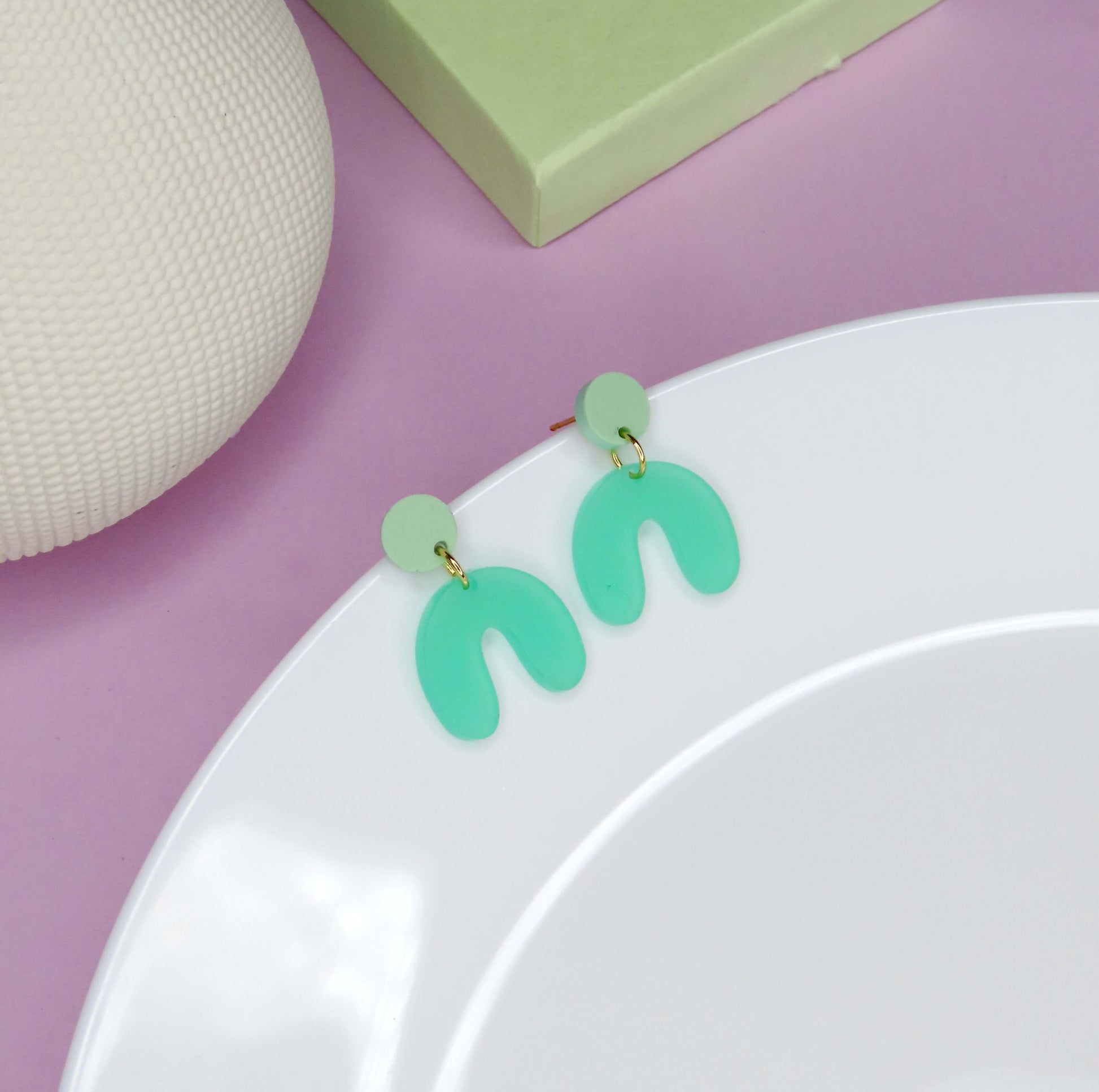 Die Ohrringe bestehen aus einem runden Acryl-Element in zartem Hellgrün, das direkt am Ohr sitzt, und einem darunter schwingenden Bogen in leuchtendem Türkis mit transparenter Optik. Die geschwungene, fast verspielte Arch-Form verleiht den Ohrringen Leichtigkeit und Bewegung, während die klare Linienführung modern wirkt.