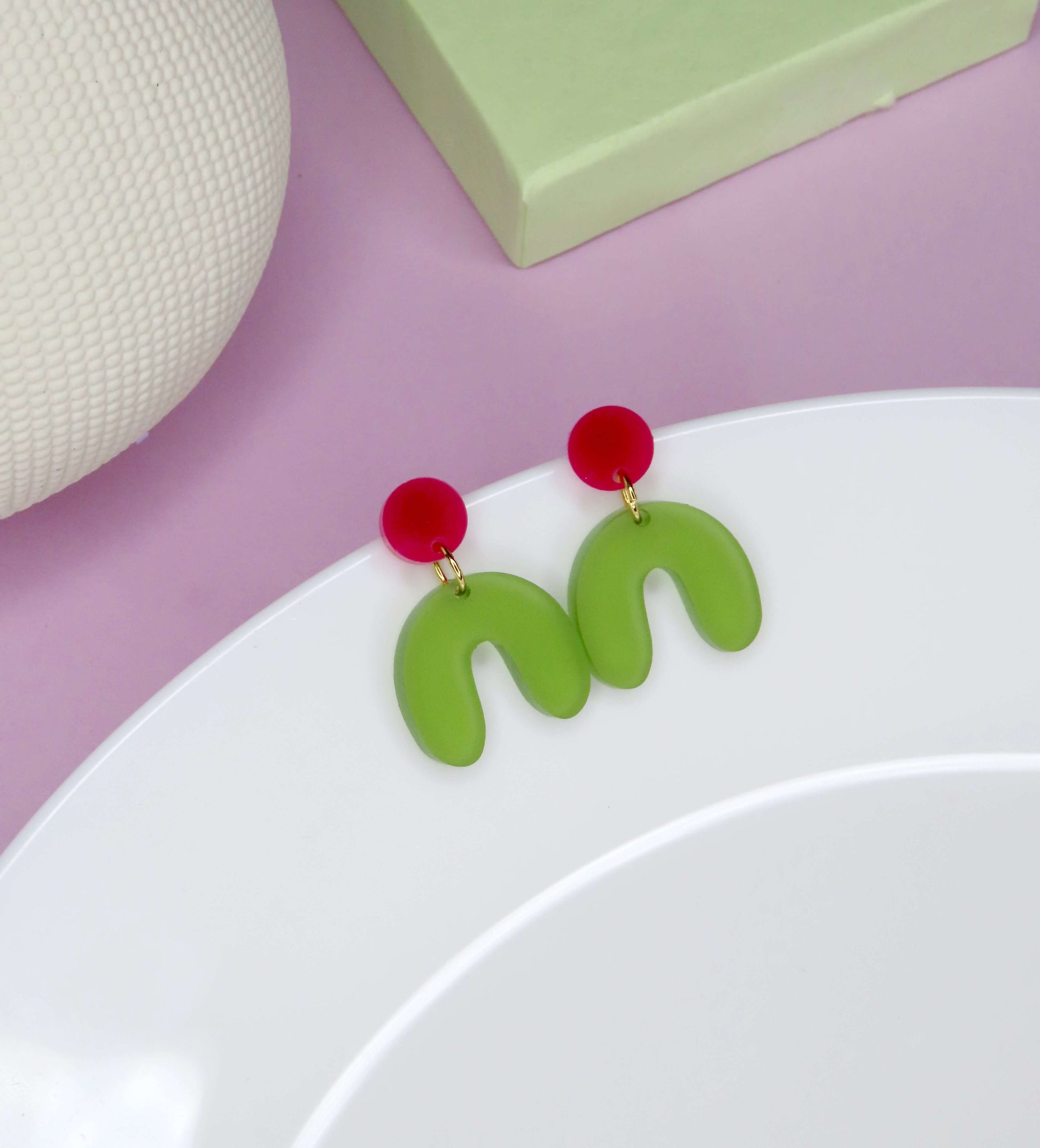 Die kleinen Arch Bogen Ohrringe bringen ein spielerisches Farbduo zusammen: kräftiges Pink trifft auf transparentes Olivgrün. Das Pink der runden Stecker wirkt lebendig, frisch und setzt sofort ein aufregendes Highlight. Das Olivgrün in transparenter Optik wirkt dagegen ruhiger, fast schwebend, und gibt den Ohrringen eine besondere Leichtigkeit.