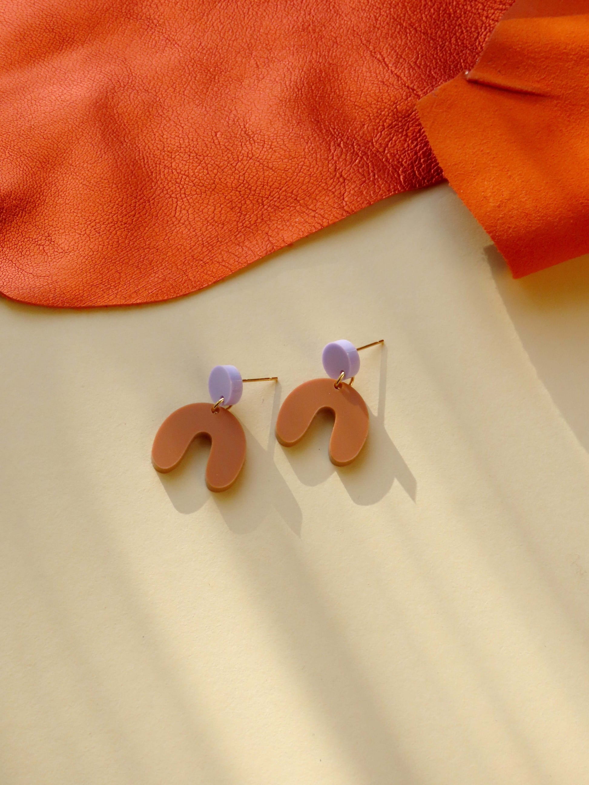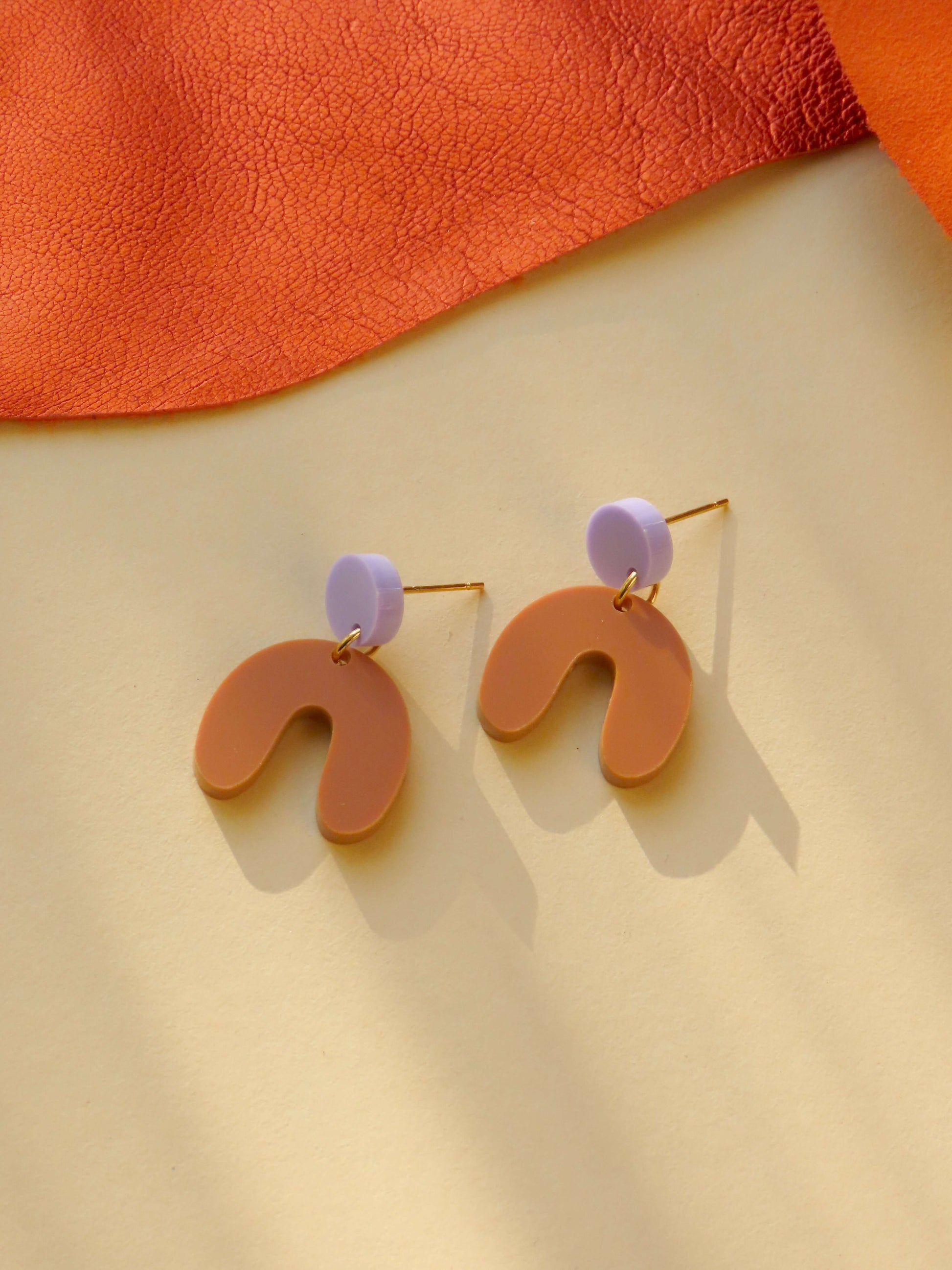 Die Kombination aus kühlem Lila und erdigem Terracotta wirkt frisch und gleichzeitig harmonisch. Der leichte Bogenanhänger schwingt sanft mit, während die Edelstahlstecker für angenehmen und sicheren Tragekomfort sorgen.