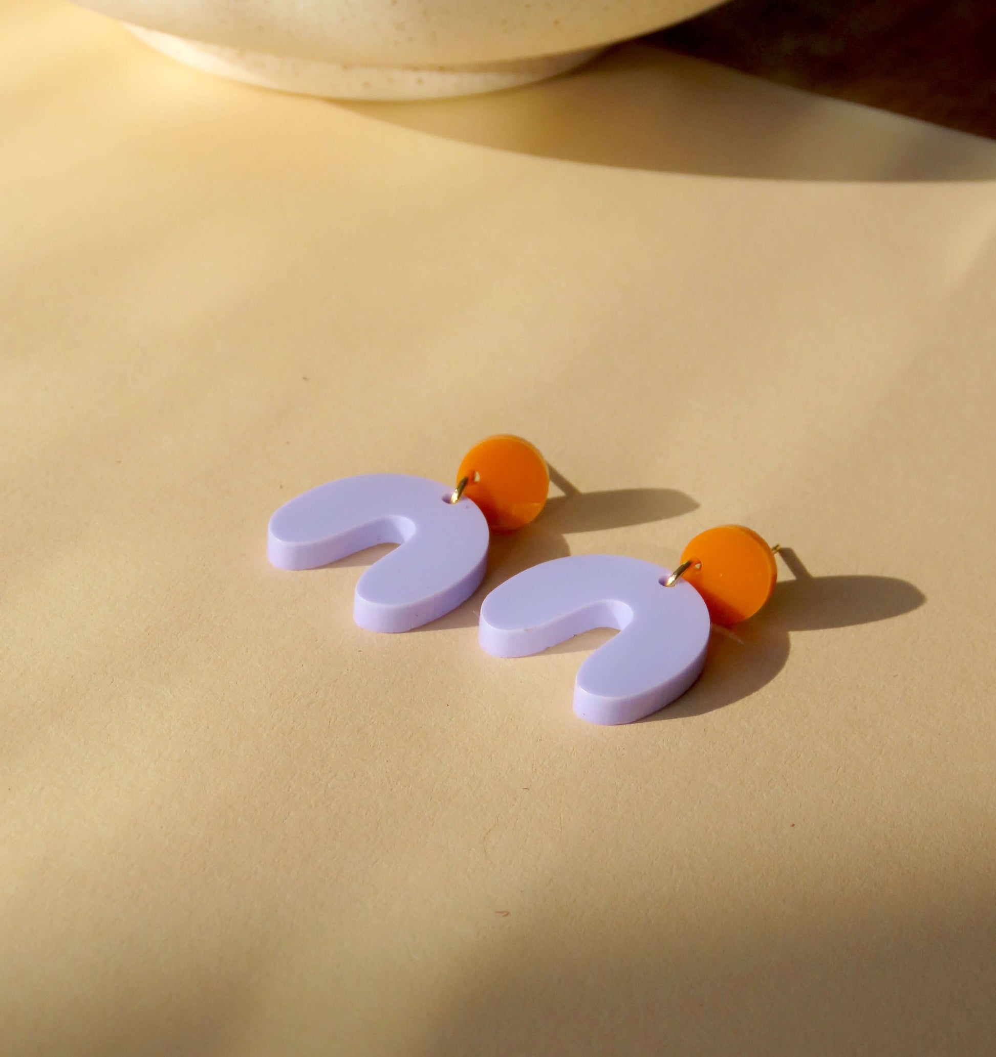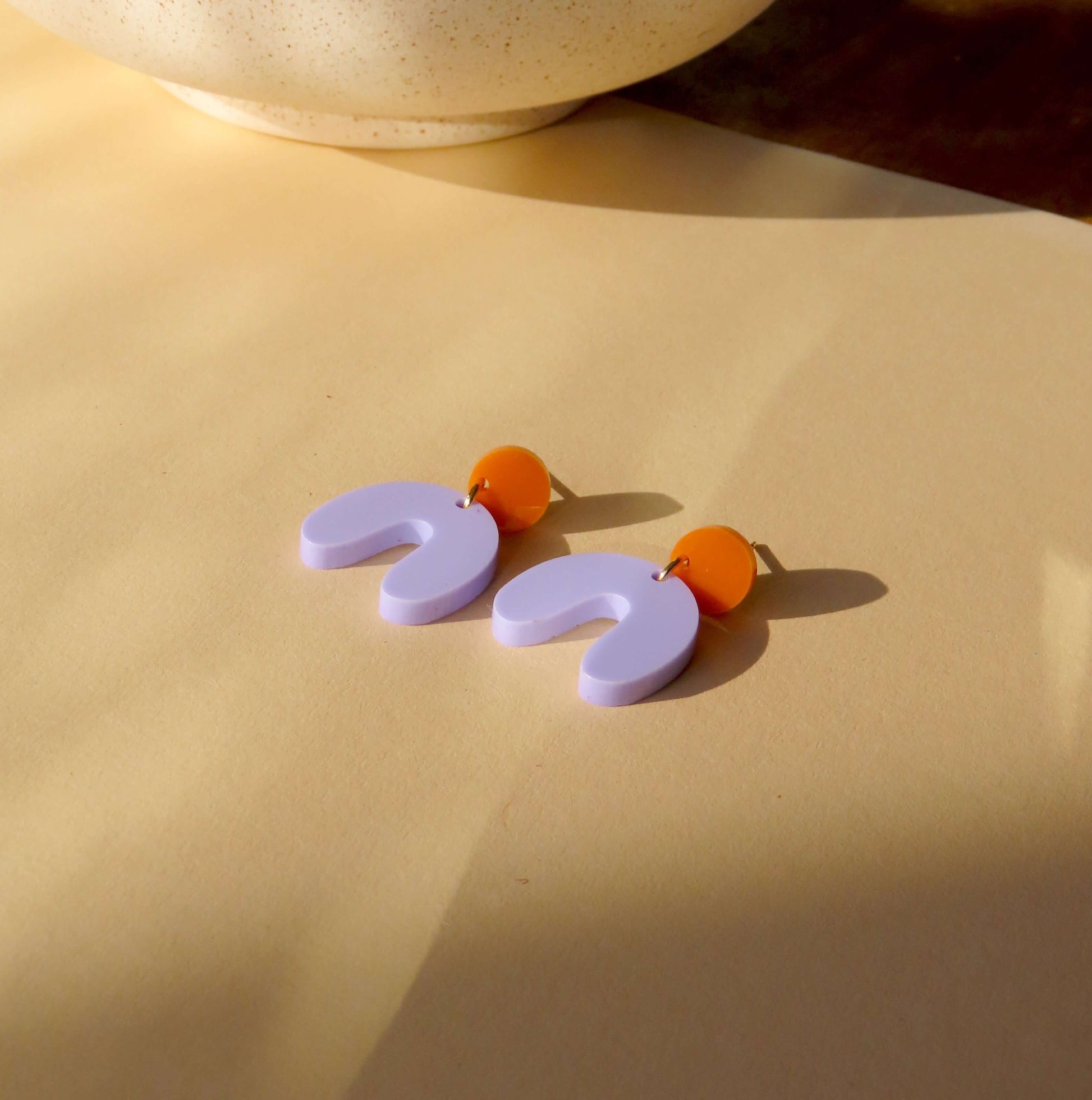 Flieder und Orangegelb sind das perfekte Duo, um deinem Look einen frischen Farbakzent zu verleihen. Die handgefertigten Anhänger aus Acryl sind angenehm leicht und bewegen sich schwungvoll mit.