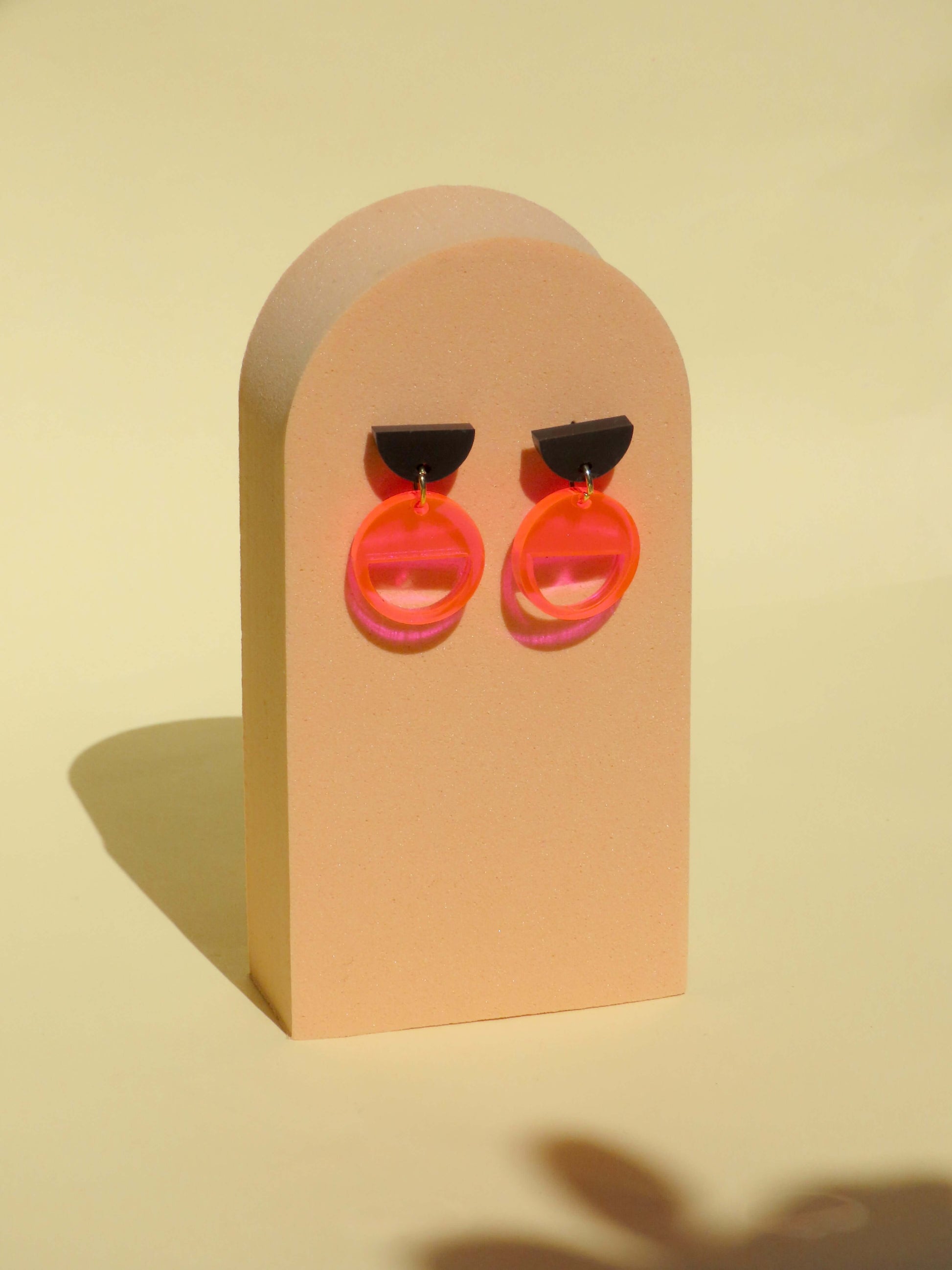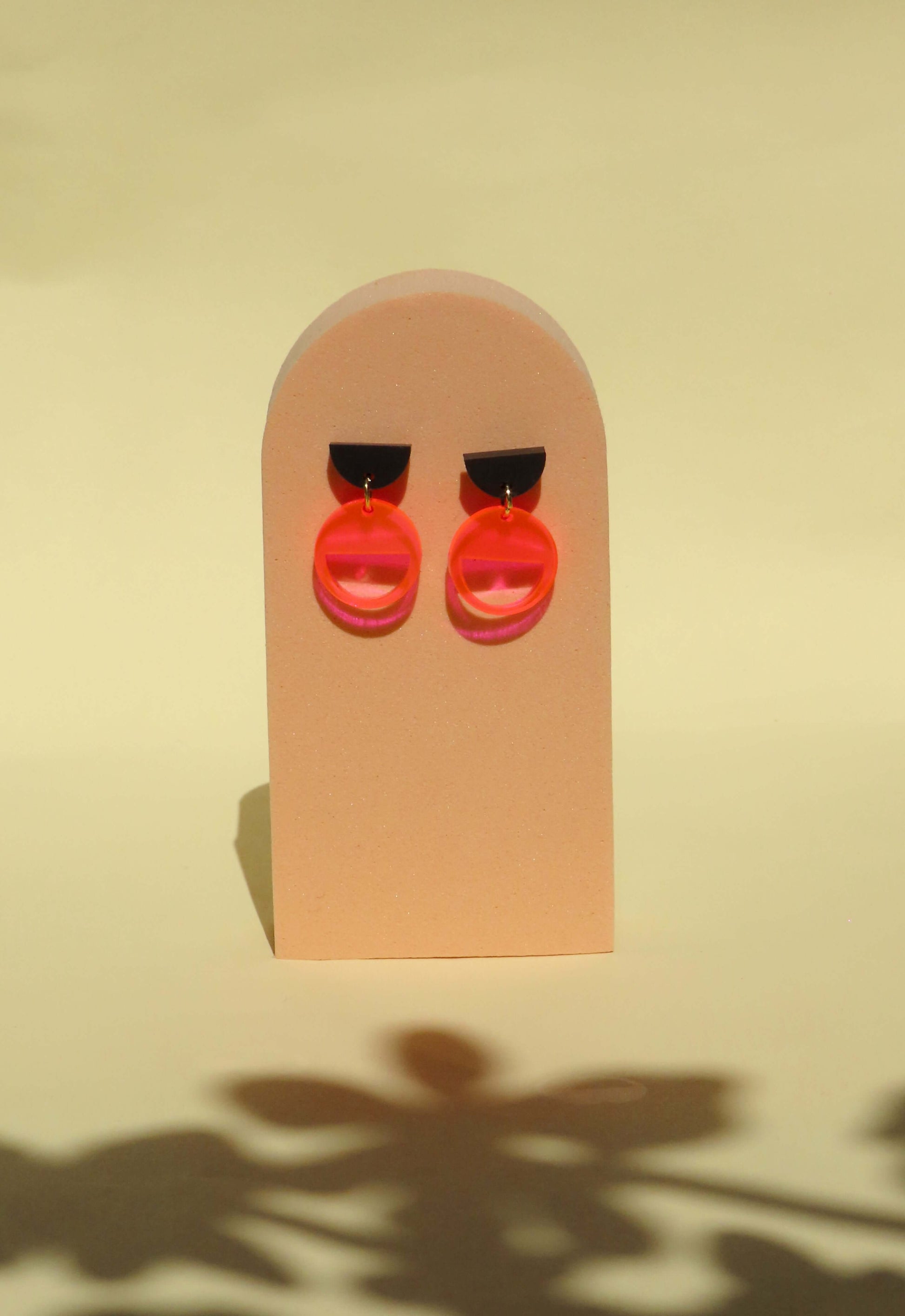 Kontrast Ohrringe in Schwarz & Neon-Pink Transparent – Halbkreis trifft Kreis