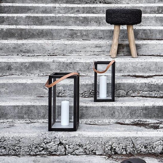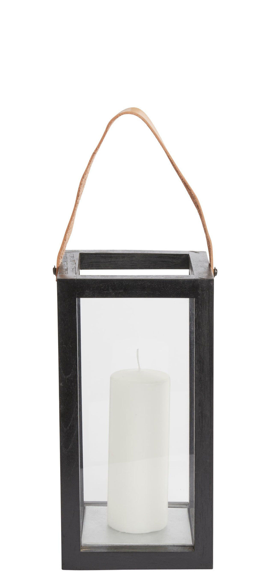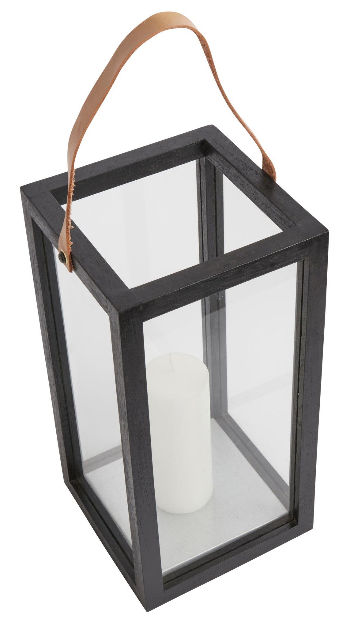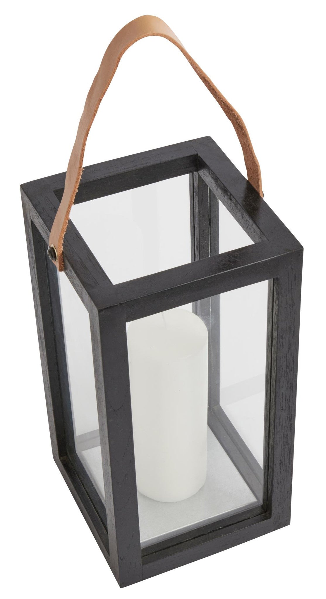 Sehr schöne Laterne aus Glas. Die Einfassungen sind aus geschwärztem Teakholz gefertigt, der Tragriemen ist aus Leder. Oben offen. Das schlichte exklusive Design macht diese Laterne zu einem echten Schmuckstück. Gut geeignet für drinnen und draußen als Dekoration oder als Windlicht mit Kerze. In zwei Größen erhältlich.